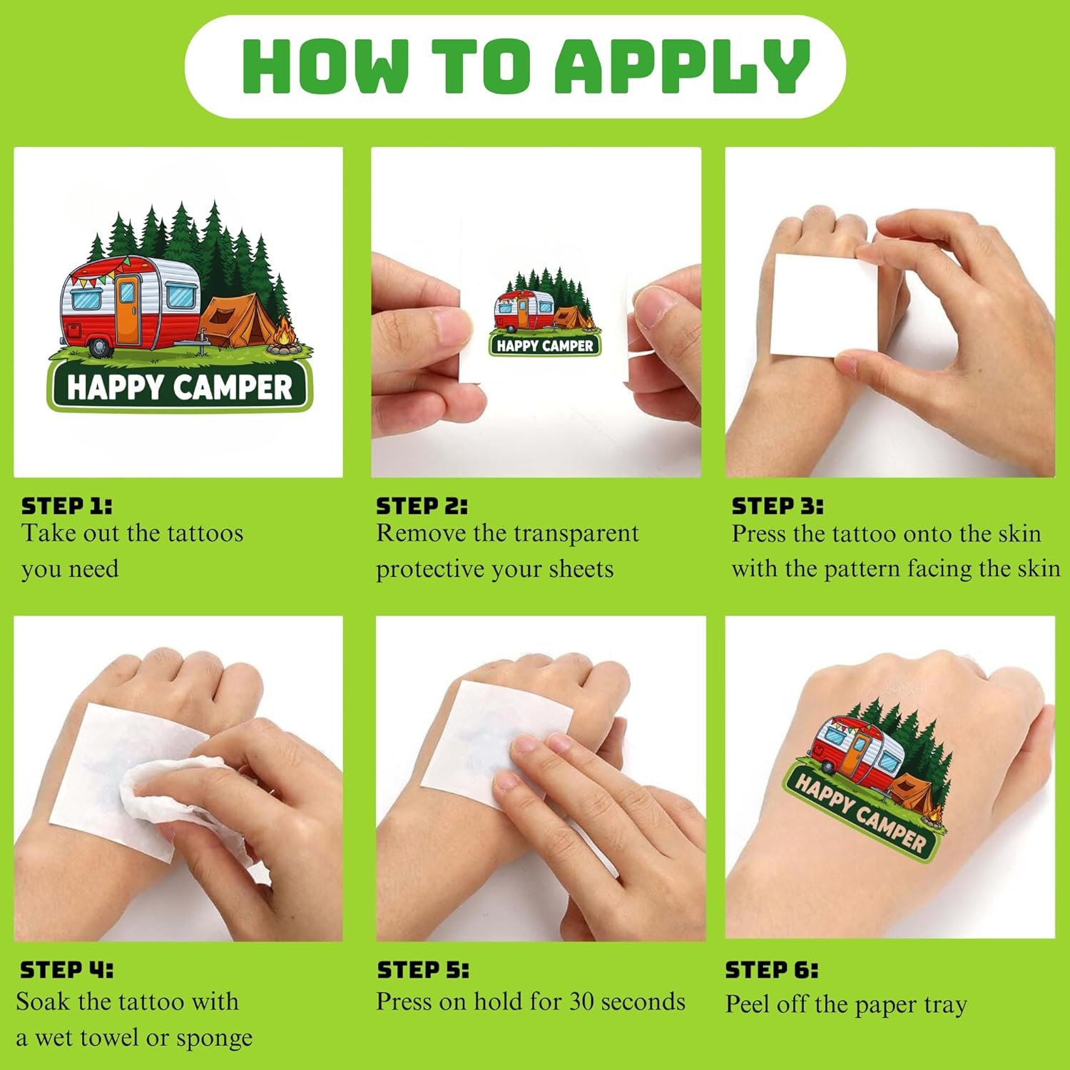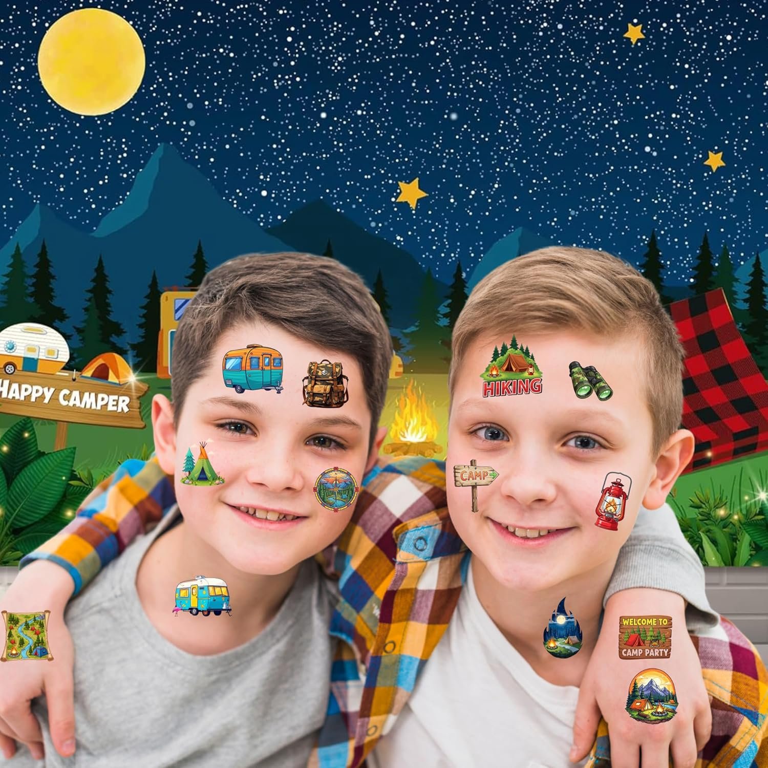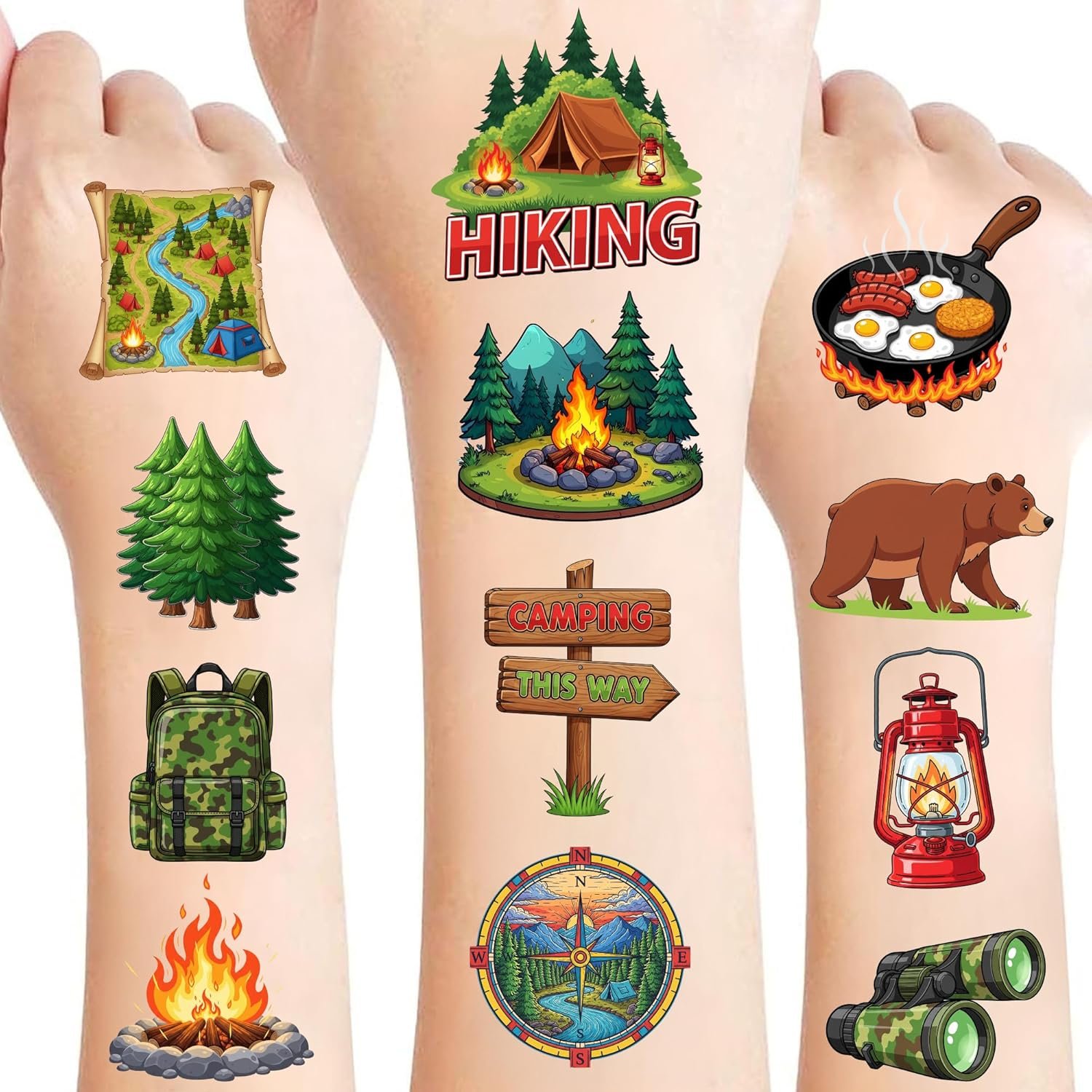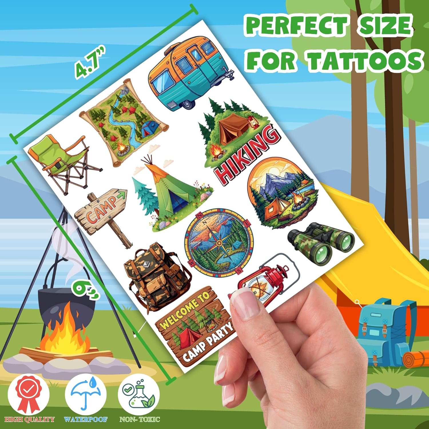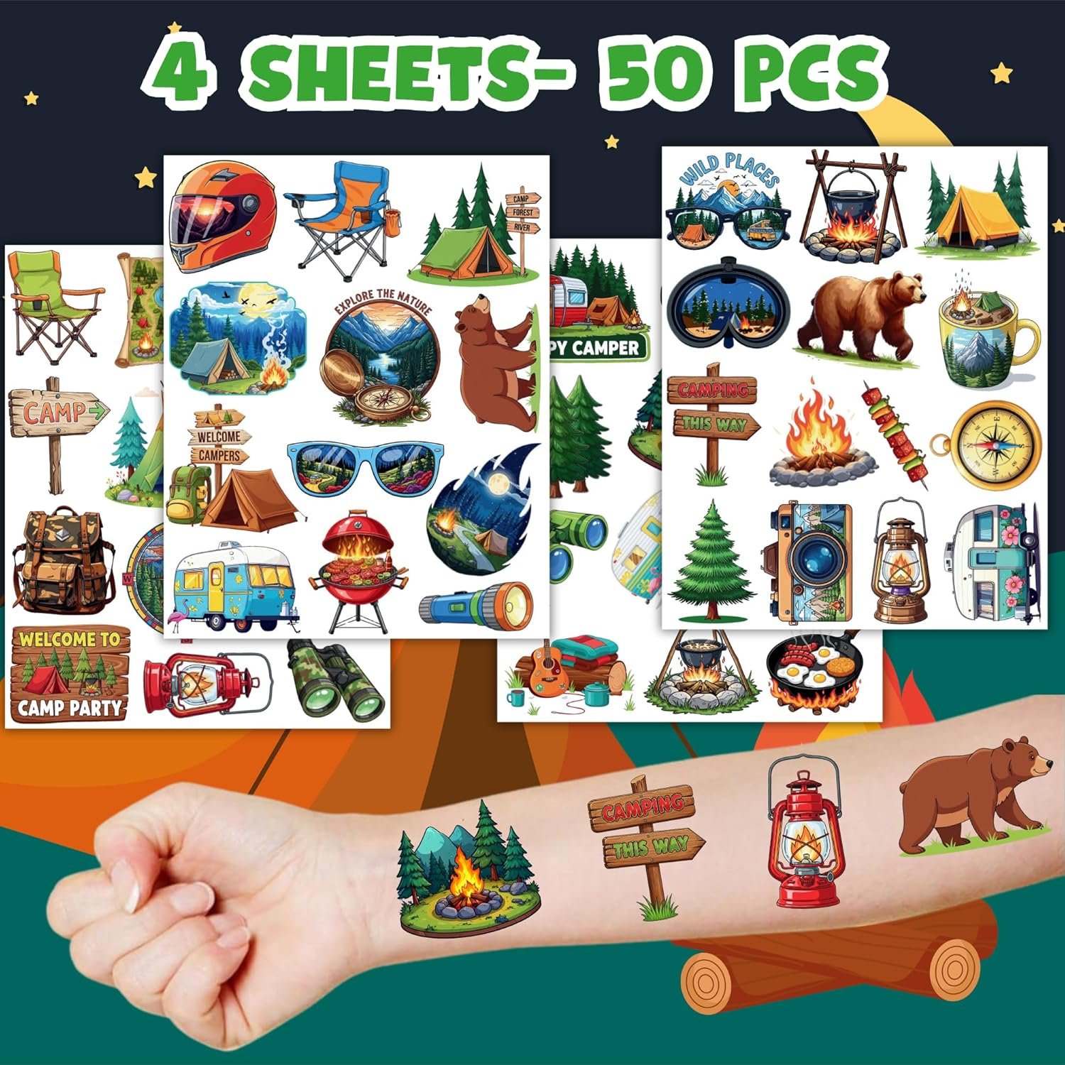 50 tatuajes temporales de campamento para niños, divertidos