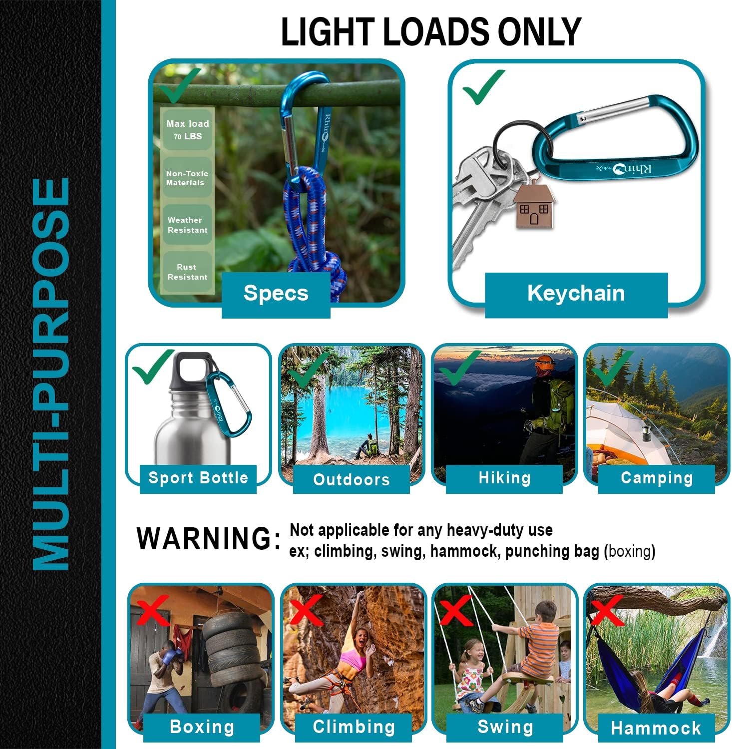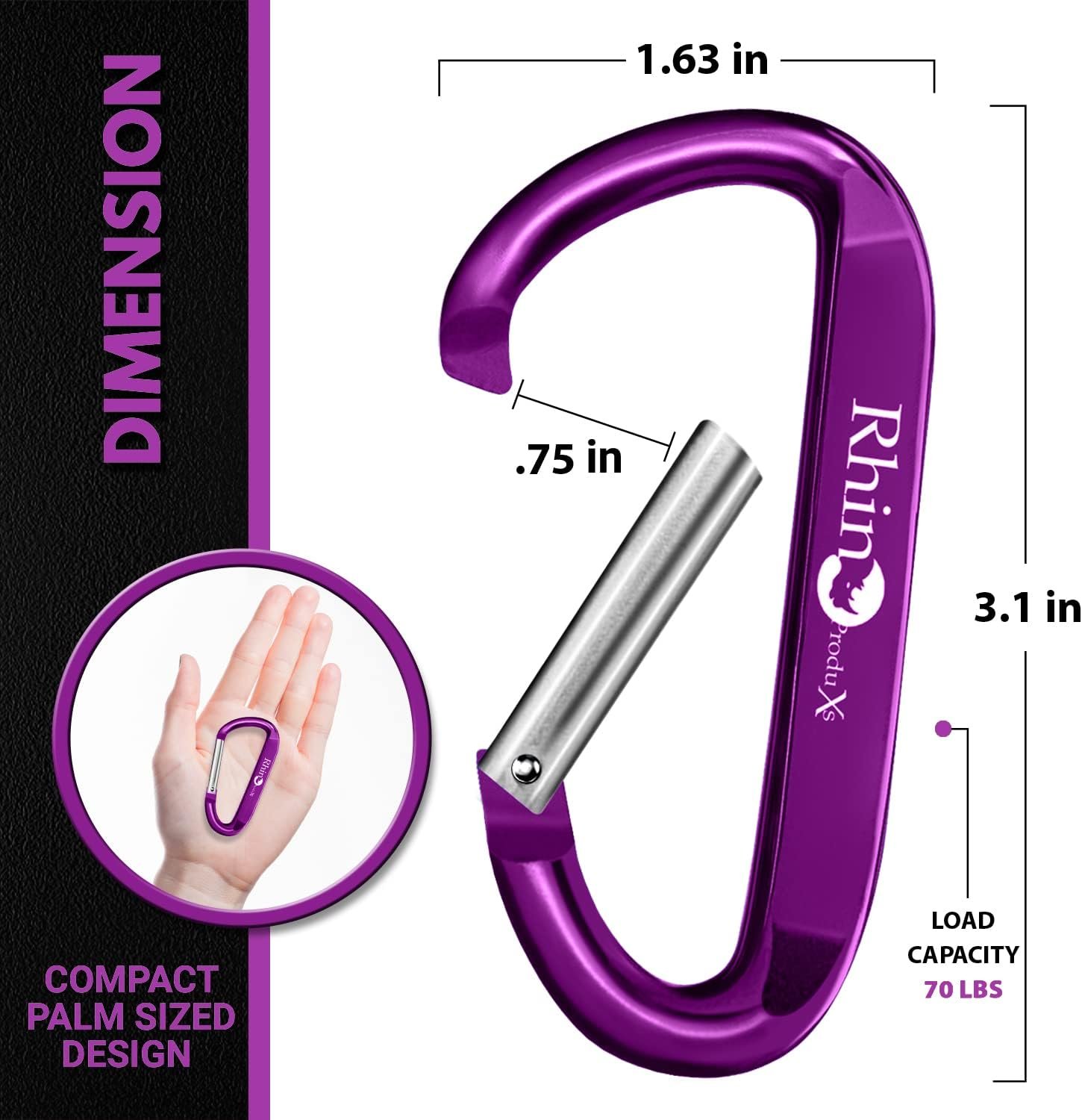 Incluye: 8 ganchos de mosquetón de 8,0 cm con diseño mejorado en forma de D que viene con 8 llaveros negros. Elegante, varios colores vibrantes, fuertes y prácticos; con borde liso. Los mosquetones ligeros Rhino están hechos de aluminio aeroespacial 6061 de alta calidad. La puerta de cierre con resorte hace que se abra y cierre muy suavemente. Recubierto con pintura de primera calidad y coloreado mediante proceso de oxidación, lo que lo hace muy duradero para un uso prolongado. Cumple con 889. Multiusos: este juego de mosquetones negro, gris, azul, verde, morado, rojo y azul oscuro viene con 8 llaveros y se puede utilizar para llaveros. Este mosquetón de llavero rápido es de una sola mano para una fácil configuración/uso. Este clip de mosquetón proporciona el tamaño de apertura de puerta más grande y un excelente compañero para acampar, kayak, ganchos, llaveros y llaveros. No apto para uso pesado. Duradero: mosquetón de llavero libre de óxido hecho de aluminio de aviación 6061, puede soportar 70 libras y está recubierto con pintura de primera calidad para un uso prolongado. Este mosquetón tiene una puerta de cierre con resorte que hace que sea suave para abrir y cerrar durante más de 5000 años. Advertencia: No apto para uso pesado o escalada. Manos libres: se utiliza para llavero, llavero y un EDC de extracción rápida (transporte diario) para camping, senderismo, mochilero, lona, bolso para viajar. Se puede utilizar como asa o colgador para tu barco, RV, pesca y casa y mucho más. Ideal para aplicaciones en interiores y exteriores, luces colgantes, suministros de tienda de campaña y mochila para fijar clips de llavero. Imperceptible Gancho de mosquetón súper ligero que pesa solo 0.62 onzas. Tienen un diseño del tamaño de la palma para que puedas llevarlo contigo todo el tiempo y son fáciles de usar. Acabado pulido brillante muy suave.