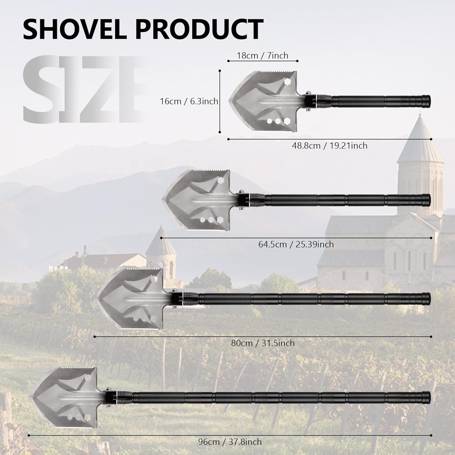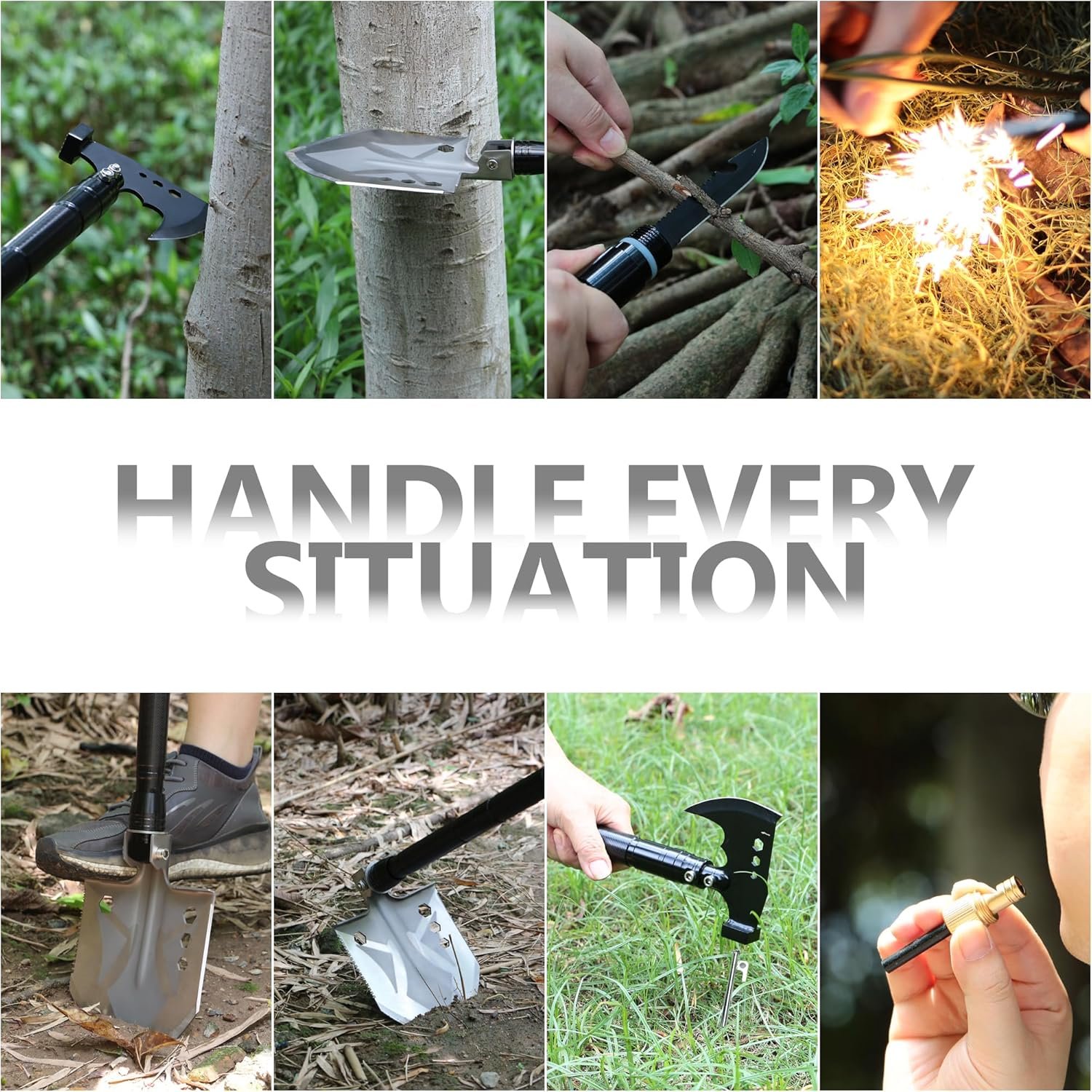 Todo en uno: este kit de supervivencia 8 en 1 está equipado con una gama de artículos esenciales para acampar, incluyendo una pala de camping, un hacha de campamento, un cuchillo de supervivencia, un kit de conos, un destornillador de doble cabeza, una lanza de pez, una varilla de magnesio silbante, un mango extendido con una brújula y una caja de almacenamiento portátil. Una combinación reflexiva de estos equipos y suministros de supervivencia puede mejorar tu capacidad de supervivencia en el desierto. CALIDAD PREMIUM: La pala plegable para acampar está hecha de aleación de aluminio 6063 resistente de alta calidad. Esto le da resistencia a la corrosión y excelente pulido. El aluminio es más ligero que otros materiales, por lo que es más fácil de transportar durante el campamento, senderismo, mochileros, supervivencia y situaciones de emergencia. Versatilidad: el juego de hachas de pala de emergencia para acampar soporta usos múltiples, como excavar, limpiar, bordear, jardinería, cortar, martillar, atornillar y silbar para una señal con el silbato de supervivencia. Hemos diseñado este kit teniendo en cuenta todos los escenarios de uso. Ampliable y ajustable: el tamaño de la pala de camping es de 99,0 cm de largo y 16,0 cm de ancho, y el hacha de camping es de 64,0 cm de largo y 12,5 cm de ancho. El mango desnudo en sí es de 54,0 cm de largo y 0,5 cm de diámetro de sección transversal. Fácil de montar: el juego de hachas de pala de camping está diseñado como ensamblado y desmontable, y todas las piezas se pueden enroscar convenientemente. Cada pieza tiene un lugar de almacenamiento correspondiente en la caja de almacenamiento, lo que simplifica el proceso de almacenamiento y lo hace sin complicaciones. Regalos de camping para hombres y mujeres.