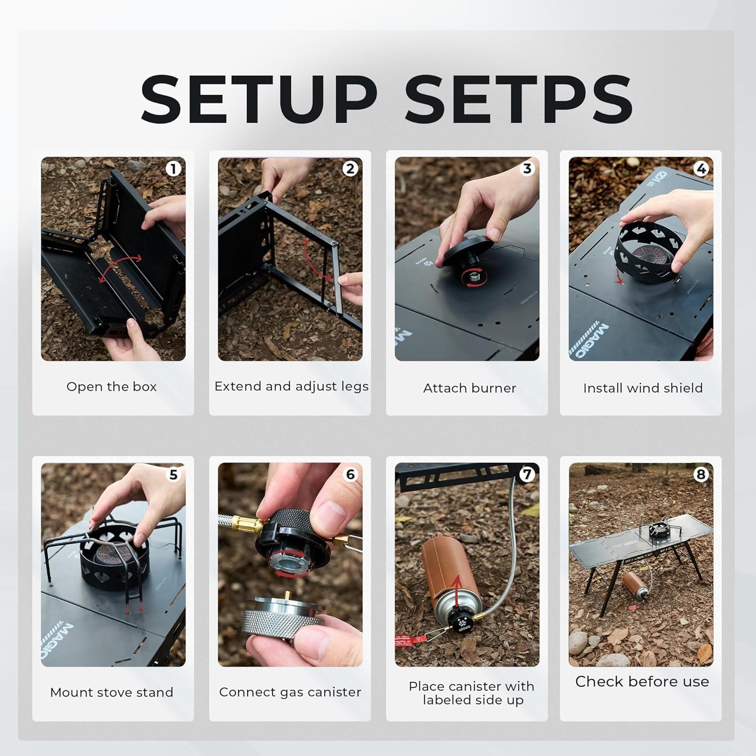 12,625 BTU de alta potencia + adaptador gratis Libera una enorme potencia de grado profesional de 12,625 BTU para hervir rápidamente. Nuestra estufa individual incluye adaptador de propano gratuito, domina tanto butano (2,500 W) para eficiencia en tierras bajas como propano (3,700 W) para gran altitud, abordando sin esfuerzo el aire fino y las condiciones de congelación donde otras estufas de camping fallan. Encendedor profesional gratuito y sistema de seguridad independiente: nuestra estufa de gas viene con un encendedor profesional para una mayor tasa de éxito que los encendedores de botón. A diferencia de los diseños integrados inseguros, nuestro sistema separado de estufa para exteriores separa el quemador del recipiente de combustible, evita el sobrecalentamiento del recipiente y los posibles riesgos de explosión durante un uso prolongado o en condiciones de viento. La manguera extendida mantiene tu combustible seguro mientras cocinas. Estable en vientos y se adapta a utensilios de cocina grandes Fabricado con una construcción de acero inoxidable completo, nuestro protector contra el viento y el soporte de estufa resisten el óxido y la deformación. El parabrisas de precisión mantiene un rendimiento estable en vientos de hasta 3 niveles, proporcionando una protección confiable para quemadores para cocinar. Nuestro soporte para estufa acomoda de forma segura ollas, sartenes y sartenes de hasta más de 7,6 cm. Compacto y plegable y con doble ajuste de altura: se pliega a un delgado 24,9 cm x 19,6 cm x 5,3 cm para servir como una estufa de mesa independiente, la pequeña mesa de campamento se expande a un tamaño completo de 65,0 cm x 24,9 cm x 26,4 cm. La mesa de playa cuenta con dos ajustes de altura ajustables (15,5 cm y 26,4 cm) para adaptarse a superficies irregulares como playa, terreno rocoso y orilla del río. Siga los pasos ilustrados para una instalación rápida y segura. Póngase en contacto con nuestro si necesita ayuda de montaje. Sistema modular con organización inteligente: nuestra mesa de campamento plegable cuenta con paneles expandibles que aumentan el espacio de trabajo (capacidad de carga de 6.6 libras, coloca artículos pesados cerca del centro). Compatible con sistemas IGT para configuraciones modulares, con orificios de montaje para soportes de luz/accesorios y ganchos laterales para colgar herramientas. Incluye bolsa de transporte organizada con dos grandes bolsillos para botes, compartimentos frontales para pequeños accesorios, revestimiento impermeable y cremalleras suaves y resistentes.