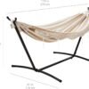Hamaca doble hecha de cómodo algodón y poliéster con un diseño de rayas beige con encaje, un soporte de acero y una funda de transporte para la hamaca Altura ajustable; los ganchos se pueden mover fácilmente a un agujero inferior para aumentar la tensión de la cuerda El soporte de 9 pies ofrece una forma que ahorra espacio; ideal para cualquier patio, terraza o patio Se adapta a dos personas y soporta hasta 450 libras Dimensiones del producto: 279,4 cm x 119,4 cm x 109,2 cm (largo x ancho x alto); peso: 29.3 libras