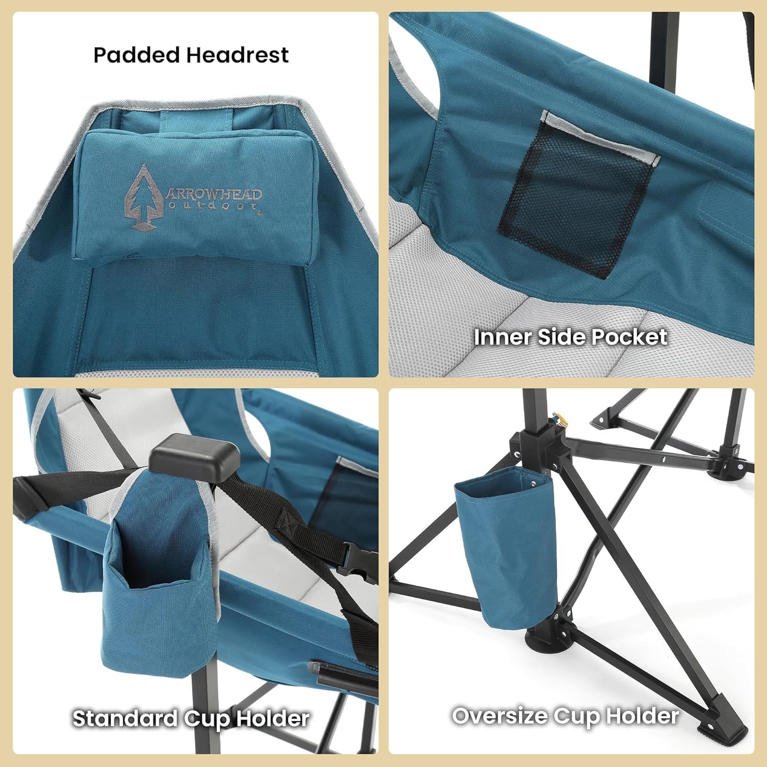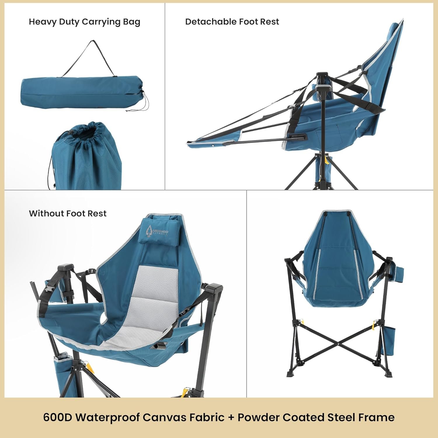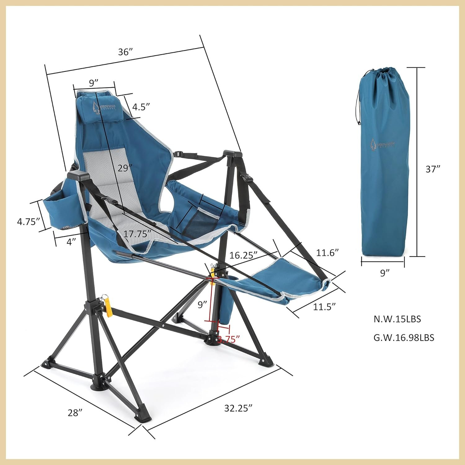 Relájate en cualquier lugar con comodidad: silla de campamento plegable estilo hamaca con un reposapiés desmontable y reposacabezas y asiento acolchados para un descanso inigualable, ya sea de campamento, en el portón trasero o en la playa. Diseño fuerte y estable: construido con pies estabilizados y materiales resistentes a la intemperie de primera calidad para manejar terrenos irregulares mientras soporta hasta 300 libras. Características prácticas a mano: incluye portavasos grandes para bebidas y equipo, además de correas ajustables para personalizar tu ángulo reclinable y posición del reposapiés. Duradero y listo para exteriores: hecho de materiales resistentes a la intemperie de primera calidad para soportar el sol, la arena y la humedad para años de uso confiable. Fácil de transportar y almacenar: se pliega de forma compacta en la bolsa de transporte incluida, por lo que es perfecta para viajes en caravana, barbacoas de patio, campamento y cualquier aventura al aire libre.