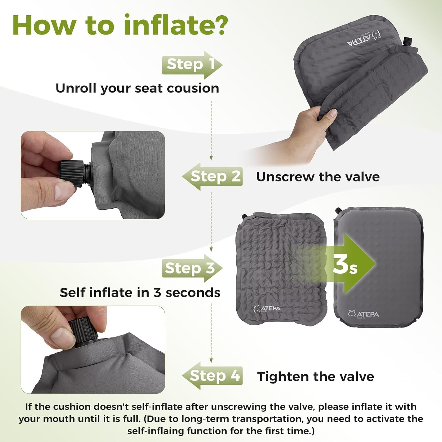 TPU Guía de primer uso y a prueba de fugas: abra la válvula para dejar que el cojín se infle automáticamente. Para el primer uso, debido a la compresión a largo plazo, sopla de 1 a 2 respiraciones para ayudar a que se expanda completamente para una mejor comodidad. Después de inflar, apriete completamente la válvula para evitar fugas de aire. Para agujeros pequeños o desgarros menores, utiliza el parche de reparación de 5,0 cm incluido para arreglarlo fácilmente. Si el problema está más allá de una reparación menor, por favor póngase en contacto con nosotros para un reemplazo o soporte Diseño ultraligero y fácil de viajar: con un peso de solo 0.35 libras, este cojín de asiento se pliega a un tamaño compacto de 15,0 cm x 8,9 cm, perfecto para deslizarse en tu mochila o incluso en un bolsillo grande. Cuando se despliega (38,1 cm x 27,9 cm x 5,1 cm), ofrece una amplia amortiguación para sentados largos en gradas, aviones, estadios o sillas de oficina Cojín de asiento inflable: se infla rápidamente sin bomba para una comodidad instantánea. Si no se infla automáticamente después de desenroscar la válvula, simplemente infla manualmente hasta su expansión completa. Nota: Es posible que se requiera inflado manual para el primer uso, ya que el cojín puede comprimirse durante el envío de larga distancia. No inflar demasiado, esto comprometerá la comodidad. Después de su uso, abre la válvula para desinflar, luego enróllala para un almacenamiento compacto y sin complicaciones COJÍN CONFORT DE DOBLE CARA Y ALMOHADA DE VIAJE: Úselo correctamente para una comodidad y durabilidad óptimas. Coloca el lado del logotipo de ATEPA hecho de suave tela elástica 30D laminada con TPU, directamente contra tu cuerpo y debajo de tus caderas para una amortiguación suave y elástica. Coloca el lado sin logotipo, hecho de pongee 190T duradero laminado con TPU, directamente en el suelo para proporcionar un soporte estable y resistente a la abrasión. El núcleo relleno de espuma ofrece una amortiguación equilibrada y un soporte confiable. Versátil por diseño, también funciona como una almohada autoinflable para exteriores o una cómoda almohada de viaje para vuelos, ofreciendo apoyo donde lo necesites Limpiable y versátil para cada escena: este cojín de asiento listo para exteriores es resistente al agua y puede ser un regalo maravilloso y perfecto para estadios, gradas, aviones, camping, senderismo, viajes, sillas de oficina, conciertos y todas las aventuras al aire libre. Funciona perfectamente en asientos duros, césped húmedo, muebles de patio, barcos, canoas y kayaks. Limpieza sin esfuerzo: simplemente limpia con una toalla húmeda Tejido respetuoso con la piel: hecho de tela elástica 30D ecológica que no contiene PVC y agradable al tacto. Diseñado para soportar la humedad sin comprometer la comodidad o la seguridad, ideal tanto para uso al aire libre como para uso diario