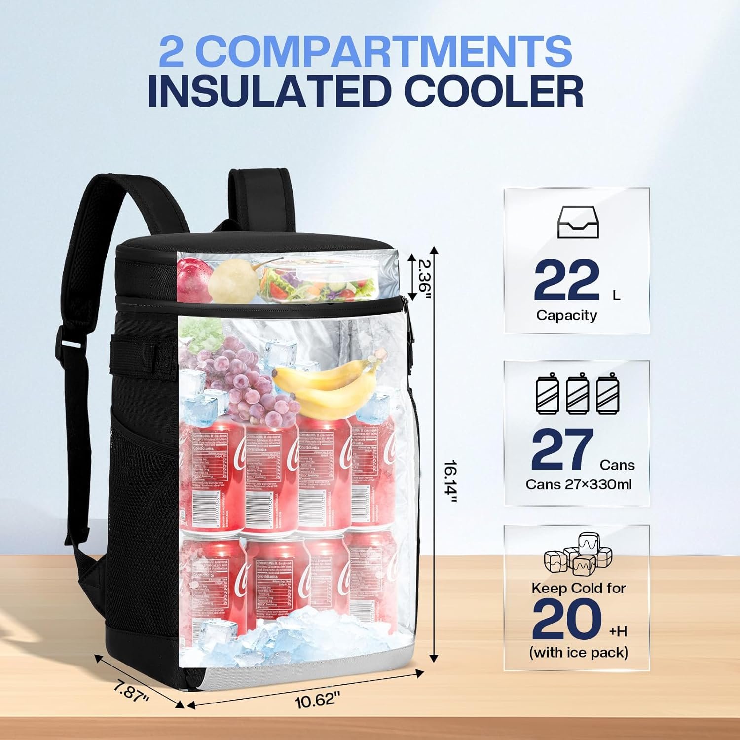 Diseño a prueba de fugas de triple capa: mantiene las bebidas frías hasta 20 horas con bolsas de hielo. Nuestro enfriador de mochila cuenta con un innovador sistema a prueba de fugas de 3 capas (sello magnético, solapa plegable y cremallera impermeable) combinado con tecnología de prensa en caliente sin costuras para evitar fugas. Ideal para viajes a la playa, camping y uso al aire libre durante todo el día donde el rendimiento confiable a prueba de derrames importa. Espacioso y ligero: Creemos en la transparencia. Esta mochila térmica aislada de 22 litros se adapta cómodamente a 27 latas (4.4 fl oz) más paquetes de hielo. Embalado eficientemente, puede contener hasta 30. Con un peso de solo 2.18 libras y un tamaño de 26,9 cm x 20,1 cm x 40,9 cm, incluye dos zonas aisladas para un control inteligente de la temperatura. Una opción ligera pero espaciosa para senderismo, viajes o como tu mochila de almuerzo diario. Organizado con múltiples compartimentos: ¡mantente ordenado sobre la marcha! Esta mochila térmica incluye dos compartimentos principales aislados para alimentos y bebidas, un bolsillo frontal, soportes laterales de malla y un abridor de botellas integrado en la correa. Perfecto como mochila de pesca, mochila de picnic o compañero de viaje. Ergonómico y cómodo para todo el día: correas acolchadas ajustables y un panel trasero transpirable ofrecen comodidad duradera. El diseño ergonómico extiende el peso de manera uniforme, ideal para senderismo, viajes y largos días al aire libre. No más dolores en los hombros, ya sea que estés en el trabajo o en un viaje de campamento. Duradero y versátil para cualquier aventura: construido con tela Oxford resistente, esta hielera de lados suaves soporta un uso resistente en todas las estaciones, desde días de playa de verano hasta salidas de invierno. Una opción práctica y elegante para hombres y mujeres que aman el aire libre, y un regalo de Navidad perfecto para estilos de vida activos.