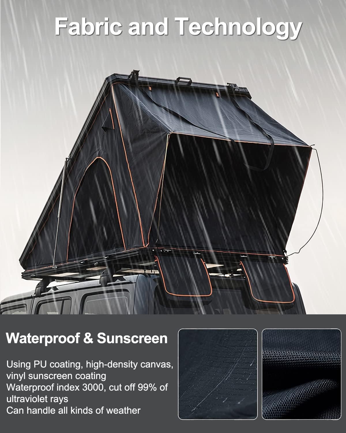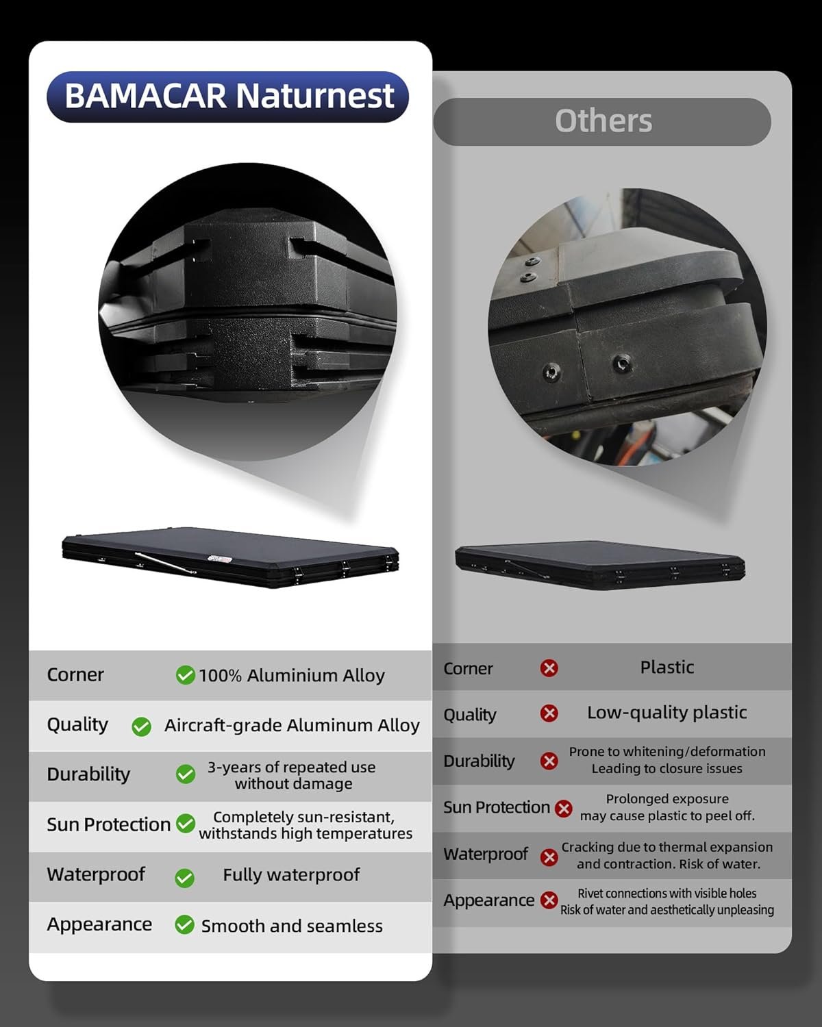 Tela impermeable Hecho en EE. UU. o importado Tienda de techo de aluminio: ¿Por qué elegir Naturnest? La carcasa dura y las esquinas de la carpa de techo Naturnest están diseñadas completamente en aluminio real. Este diseño cuenta con una durabilidad excepcional. Por el contrario, otras marcas de carpas en la azotea suelen utilizar plástico para sus esquinas, no una construcción de aluminio completa. Con un mayor uso o exposición frecuente a la luz solar, estas esquinas de plástico de otras tiendas de campaña de techo de marca son propensas al envejecimiento, deformación y problemas con el sellado y el cierre adecuado Tienda de techo emergente: La carpa de techo rígido viene equipada con puntales neumáticos de acero inoxidable, lo que permite un despliegue o almacenamiento fácil y rápido de la tienda de la azotea. Experimenta una configuración rápida para aventuras de camping en coche. Nuestra tienda de campaña de techo es compatible con vehículos de todas las alturas, incluyendo SUV, Jeeps, furgonetas, camiones, etc Tienda de techo impermeable para 4 estaciones: la carpa de techo cuenta con aleación de aluminio de grado aeroespacial, tela de poliéster de 11.29 oz y cremalleras YKK. Puede soportar vientos de hasta 6 niveles, tiene un nivel de resistencia al agua de W/R 196.850 in y proporciona un 99% de protección UV. Transpirable y no sofocante para el verano y la temperatura permanece cálida con la entrada cerrada para el invierno, por lo que es adecuado para todas las estaciones Tienda de campaña para automóviles con familia: Dimensiones de la tienda: 83 × 51 × 149,9 cm, proporcionando un amplio espacio para 2-3 personas. Equipado con 2 barras de equipaje en la parte superior, lo que te permite llevar más equipaje, bicicletas, paneles solares, tablas de surf, etc. Ideal para viajes en familia o parejas Equipo completo Overland: Naturnest viene con un equipo de camping más abundante en comparación con otras marcas: una barra de equipaje en la parte superior de la tienda (lleva más equipaje), tiras de luz LED, 3 entradas, escalera, bolsa de escalera (evitar ensuciar la tienda), 2 bolsas impermeables para zapatos, 10 espacios de almacenamiento, un colchón no deformante de 2.0 in, y debajo del colchón, hay una almohadilla de condensación para aislar el vapor de agua. y una plataforma oceánica para Evitar el agua Ayuda al cliente en línea: Si tienes alguna pregunta, ¡nuestro equipo está aquí y te puedo ayudar!
