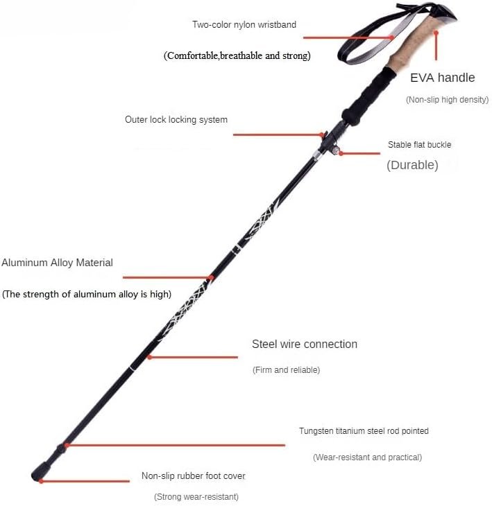 Bastones de senderismo plegables: cabe en tu mochila. A diferencia de los bastones de senderismo tradicionales, cada uno de nuestros bastones de trekking de montaña para senderismo es plegable hasta 5.1 in. Cabe fácilmente en tu mochila o equipaje facturado para que puedas llevar uno o un par dondequiera que vayas. ¡Ahora puedes caminar, caminar y caminar donde quiera que vayas! Bastones de senderismo ligeros: ¡aumenta la impresión de tu pie! Los bastones de senderismo son una herramienta esencial para cualquier excursionista serio. Conocidos como bastones de senderismo para mujeres, estos bastones de senderismo son plegables y ligeros, solo 9 onzas (9.14 oz) cada uno. Cada paquete viene con 1 pieza de bastón de trekking. Bastones de senderismo ajustables: las alturas de estos bastones son ajustables de 43.5 a 132,1 cm (43.3-51.2 in) con nuestro cierre de metal de propiedad. Ajusta la altura para adaptarse a tu zancada para que puedas caminar durante períodos más largos sin cansarte. Estas longitudes significan que los usas como bastones para personas mayores, mujeres, hombres o como bastón para niños Construido para durar Agarra nuestros bastones de senderismo fiables para senderismo plegables antes de salir al sendero. Cada poste está construido con aleación de aluminio de grado aeronáutico y diseñado a los detalles. Tanto las mujeres como los hombres pueden obtener lo mejor en apoyo y estabilidad. También se pueden utilizar como bastones de senderismo nórdicos para mujeres. Agarre cómodo Nuestros bastones para senderismo para personas mayores tienen un agarre de espuma EVA que absorbe el sudor que está diseñado para caminatas en cualquier terreno. Son perfectos para excursionistas de todos los niveles, desde principiantes hasta excursionistas experimentados. Ya sea que lo utilices para caminar en colinas, mochileros, senderismo, caminatas nórdicas o raquetas de nieve, el poste proporciona apoyo y estabilidad en el sendero Ayuda a prevenir la fatiga: los bastones para mujer absorben los golpes para reducir el riesgo de lesiones de rodilla, especialmente en pendientes pronunciadas o cuesta abajo. Ayudan a aumentar la superficie de su huella, proporcionando estabilidad adicional en terrenos irregulares o resbaladizos.