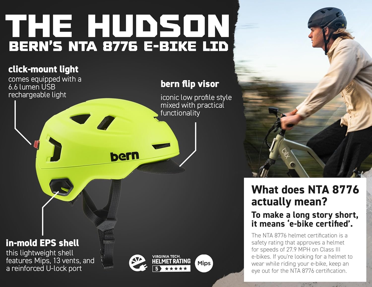 El estilo se une a la seguridad: el Hudson MIPS ofrece el aspecto característico de Berna de bajo perfil con protección adecuada para viajes por la ciudad, ciclismo de carretera y otros usos diarios. Certificado para bicicletas eléctricas para impactos de hasta 27 mph Protección superior: la tecnología MIPS absorbe las fuerzas de rotación de impactos en ángulo, protegiendo tu cerebro de torsiones peligrosas durante los choques, reduciendo el riesgo de conmoción cerebral Muy versátil: con un peso de solo 13.05 oz, el Hudson es ideal para desplazamientos, paseos en bicicleta de fin de semana y viajes en scooter eléctrico, ofreciendo flujo de aire, comodidad y ajuste seguro para uso durante todo el día Iluminación integrada: luz LED trasera a presión con 3 modos (constante, flash, pulso), duración de la batería de 10 horas, resistencia al agua y recarga USB garantizan que permanezca visible en condiciones de poca luz Diseñado para mayor comodidad: 13 rejillas de ventilación proporcionan ventilación, mientras que el dial Compass Fit se ajusta fácilmente para un ajuste seguro. Las rejillas traseras reforzadas te permiten bloquear el casco con un bloqueo en U estándar