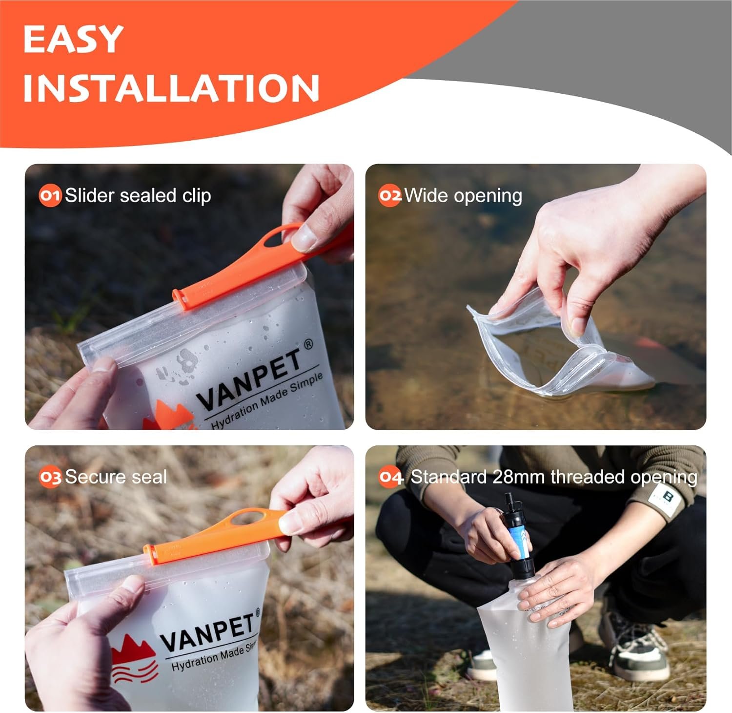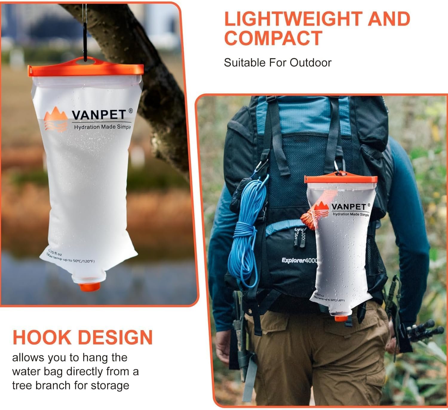 Compatible con varias pajitas de filtro: esta botella de agua plegable recoge fácilmente agua de lagos, ríos, arroyos y fuentes municipales. Es compatible con Membrane Solutions, LifeStraw, Sawyer MINI, Micro Squeeze, y la mayoría de filtros de agua con tapa de rosca de 1.102 in, lo que lo convierte en un sistema de filtración exprimible confiable para aventuras al aire libre. Diseño de doble apertura: la bolsa de agua tiene un diseño de doble apertura con una amplia apertura sellada deslizante para un llenado rápido de agua, y una apertura de tornillo estándar estilo botella de agua que combina perfectamente con el filtro de agua para garantizar que tengas acceso al agua potable limpia sin importar dónde estés. Material de TPU de alta calidad: esta bolsa de agua está hecha de material TPU duradero, que es más duradero, resistente a la abrasión y a prueba de fugas que los materiales tradicionales. Nunca se romperá incluso si se cae accidentalmente Ultraligera y plegable: con un peso de solo 2.69 onzas, esta bolsa de agua de 2 litros es ligera y plegable, proporcionando una portabilidad excepcional para excursionistas y campistas por igual Sellado fuerte Adoptando materiales y artesanía confiables, la bolsa de agua es impermeable y a prueba de fugas, y puede funcionar normalmente en condiciones de calor o frío, por lo que puede sellar bien el líquido interno para evitar fugas de líquido.