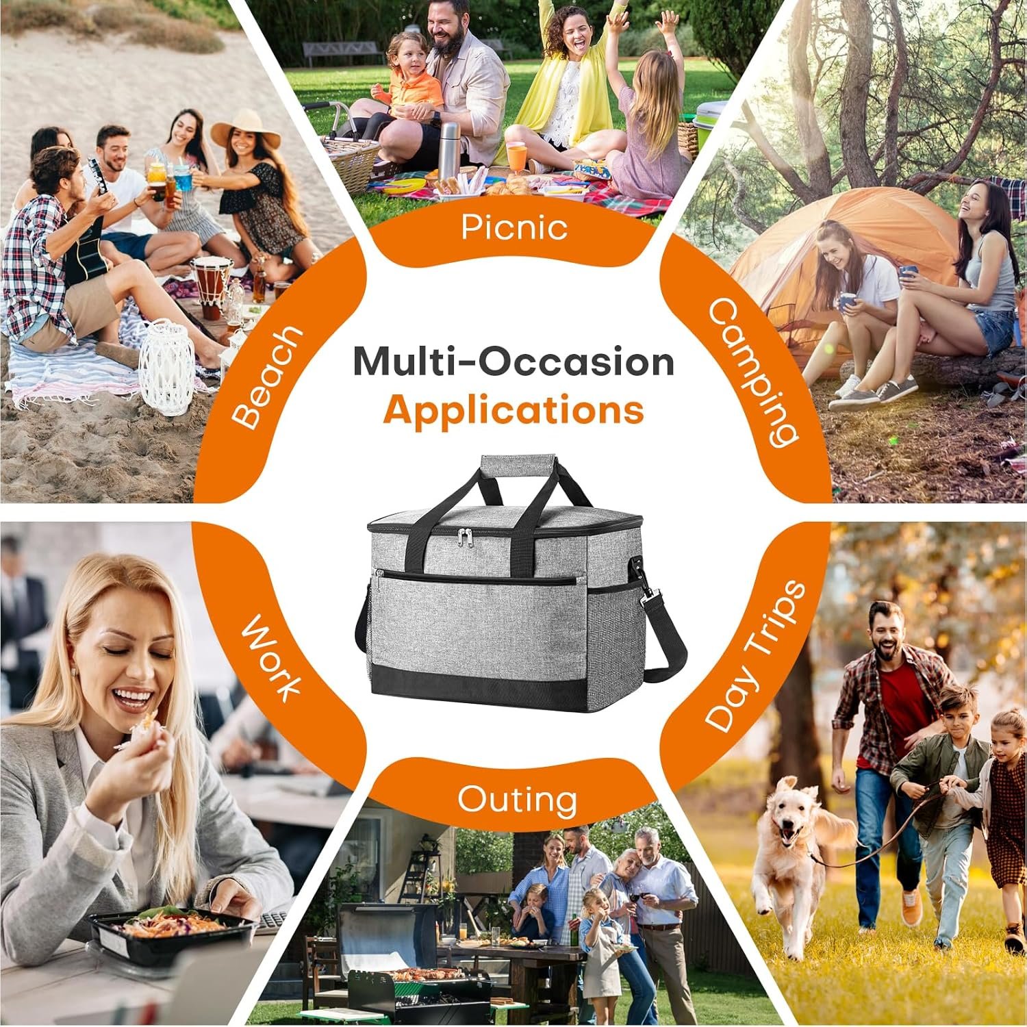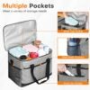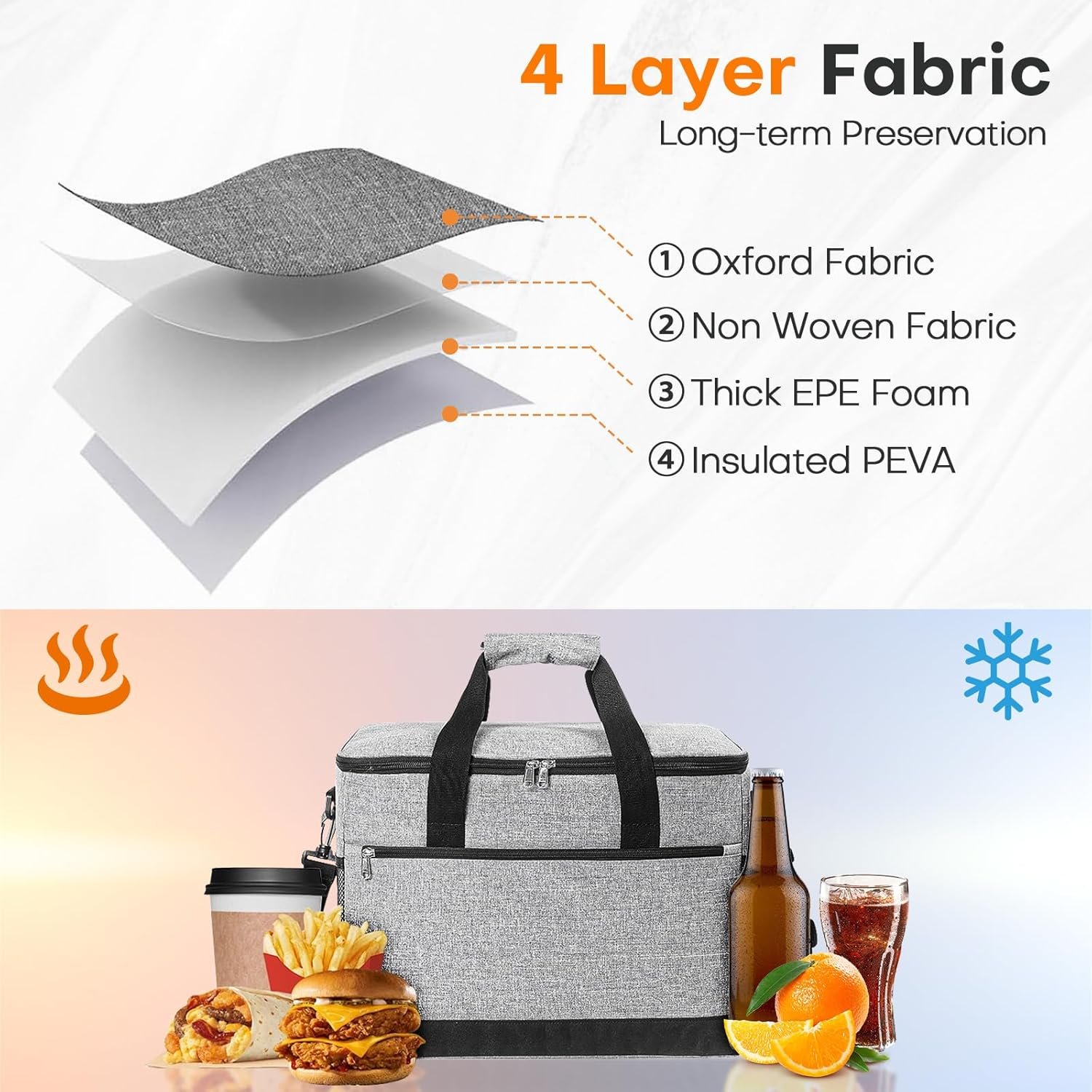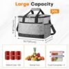 Diseño de bolsa térmica aislada de 4 capas con algodón perla de alta densidad + forro PEVA de alta calidad, mantiene las temperaturas frescas durante 6-8 horas y el calor durante 3-6 horas. (La duración real puede variar dependiendo de las condiciones de uso) Diseño de producto: diseñada para mayor comodidad y ahorro de espacio, esta bolsa térmica portátil se comprime fácilmente cuando no está en uso, encajando perfectamente en espacios pequeños, su fácil almacenamiento y portabilidad la convierten en una opción ideal para el uso diario. El compartimento frontal con cremallera asegura lo esencial, mientras que los bolsillos laterales de malla elevados sostienen placas/paraguas Uso de tela Oxford 600D y construido con costuras reforzadas que se mantienen bien, esta bolsa más fresca ofrece una integridad de costura confiable para un uso regular. La cremallera de deslizamiento suave añade comodidad a tu rutina diaria, por lo que es fácil acceder al contenido cuando sea necesario Nuestra bolsa térmica de viaje utiliza tecnología de costura termosellada que crea un interior sellado para minimizar el riesgo de fugas. Perfecto para acampar, días de playa o viajes para mantener la comida fresca durante más tiempo. (Nota: La condensación externa puede ocurrir a altas temperaturas) Nuestra bolsa térmica grande aislada puede contener hasta 30 litros (7.9 galones) por volumen. Las dimensiones totales del enfriador suave son de 40,9 cm x 25,9 cm x 30,0 cm. Lo suficientemente espaciosa como para adaptarse a todos tus artículos esenciales de picnic, esta bolsa térmica de lados suaves también es tu opción para acampar, senderismo, barbacoas, viajes de un día o compras