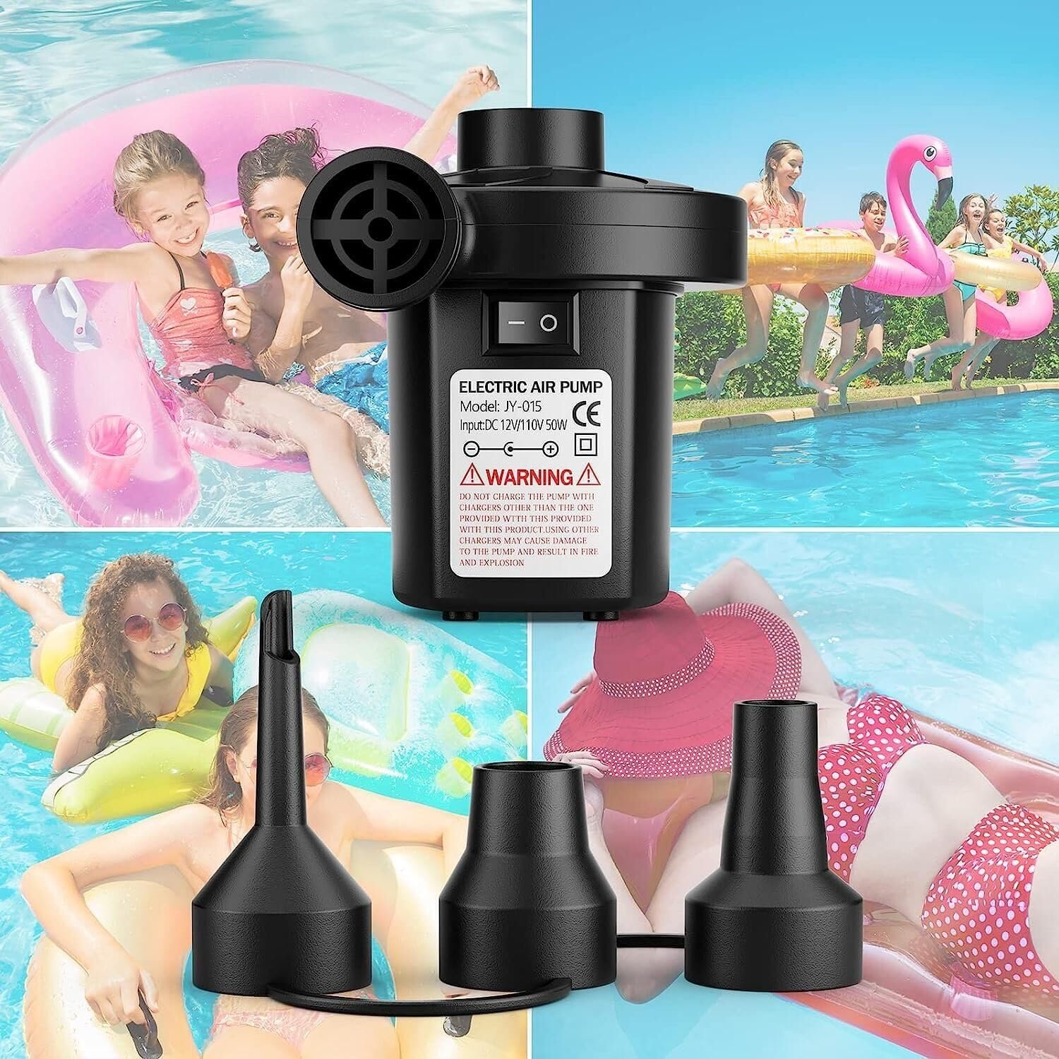 Componentes incluidos: 1 adaptador de corriente para automóvil, 1 adaptador de corriente para el hogar, 1 bolsa de transporte, 1 manual de usuario (idioma español no garantizado), 1 bomba de aire eléctrica, 1 boquilla de 3 tamaños diferentes