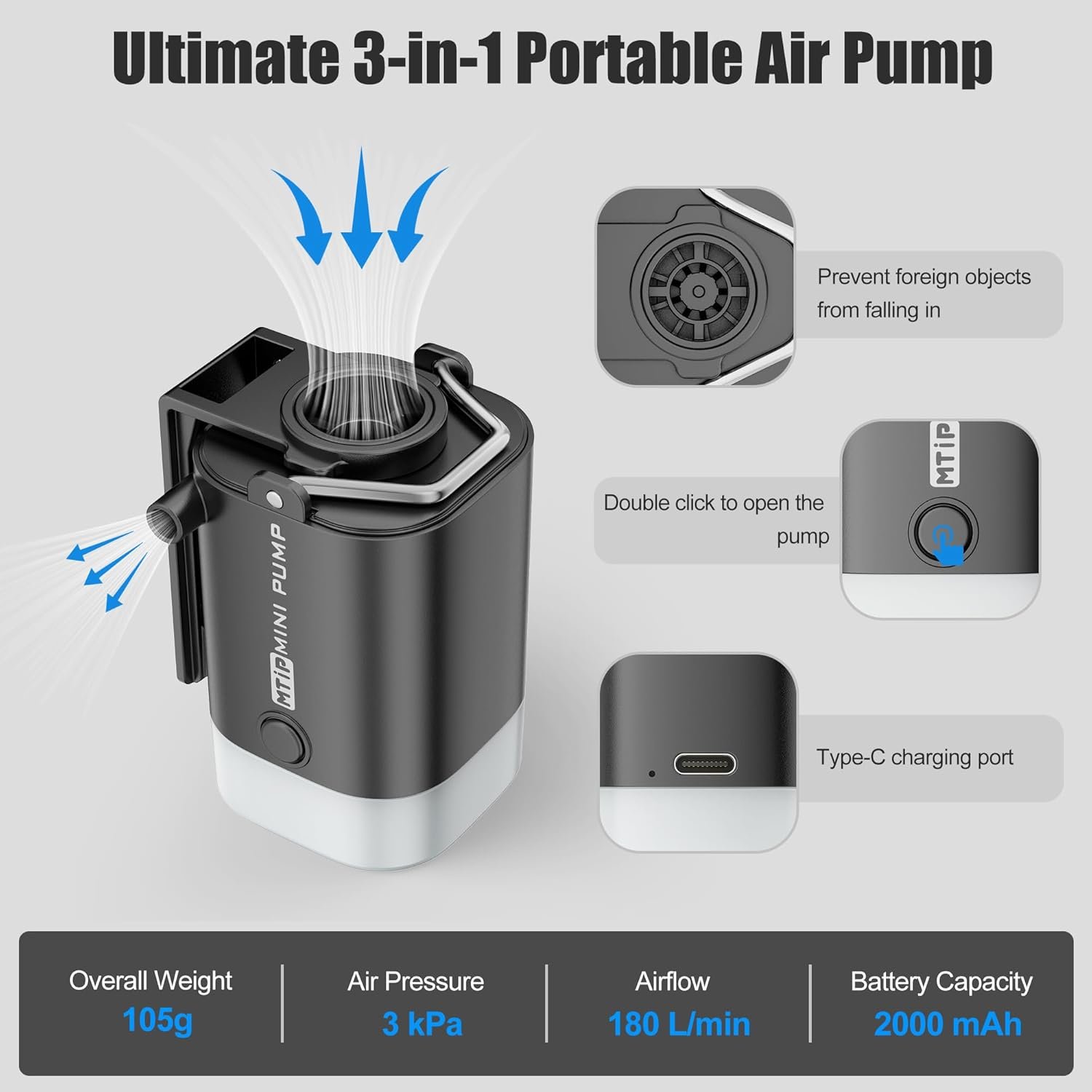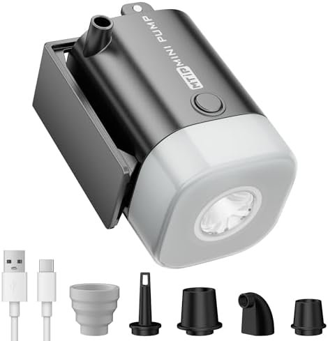 Batería recargable de 2000 mAh: Esta bomba de aire portátil para inflables está equipada con una batería de 2000 mAh de alta capacidad. Una carga completa proporciona hasta 25 minutos de uso continuo, por lo que es fácil inflar múltiples colchones de aire, flotadores de piscina y almohadillas para dormir con una sola carga Carga rápida: con un puerto tipo C, esta bomba de aire eléctrica admite una carga rápida a través de un banco de energía, cargador de automóvil, computadora portátil o toma de pared. No hay necesidad de depender de fuentes de alimentación fijas: cargue en cualquier momento y en cualquier lugar. Ideal como bomba de aire de campamento o para uso diario en el hogar Potente inflado y desinflado: con presión de aire de 3 kPa y flujo de aire de 180 l/min, esta pequeña bomba de aire puede inflar rápidamente colchonetas, colchones de aire, flotadores de piscina y más. También funciona como una bomba de vacío de viaje, desinfla eficientemente bolsas de almacenamiento para ahorrar espacio para viajes u organización del hogar Mini diseño: pesa solo 0.23 libras y mide 4,3 cm x 4,3 cm x 6,9 cm (aproximadamente del tamaño de un huevo), esta bomba de aire portátil cabe fácilmente en tu mochila o bolsillo. Su funcionamiento con un solo botón hace que sea conveniente para aventuras al aire libre y uso doméstico por igual 5 boquillas y amplia compatibilidad: viene con 5 boquillas intercambiables, esta bomba de aire para inflables es compatible con una amplia variedad de inflables, incluyendo colchones de aire, almohadillas para dormir, sofás inflables, flotadores de piscina, anillos de natación, juguetes inflables y bolsas de vacío. No requiere adaptadores adicionales, solo tienes que conectar y empezar a inflar Luz de camping de 4 niveles: esta pequeña bomba de aire incluye una linterna de camping incorporada en la base, que ofrece 4 modos de brillo ajustables. Perfecto para uso en exteriores, funciona como linterna y luz de tienda, proporcionando hasta 11 horas de iluminación continua. El gancho integrado permite colgar fácilmente dentro de las tiendas de campaña Multifuncional para uso en exteriores y en el hogar: más allá de inflar y desinflar, esta bomba de aire para acampar puede ayudar a encender fogatas más rápido dirigiendo el flujo de aire, un gran compañero para acampar, senderismo, viajes a la playa y hogueras en el patio trasero Construcción de ABS duradera y de alta calidad: hecha de ABS resistente al desgaste con tecnología de sellado avanzada, esta mini bomba de aire está diseñada para durar. Es a prueba de fugas y confiable, incluso en condiciones extremas al aire libre Perfecto para acampar, viajar y uso diario: ya sea que necesite una bomba de aire portátil para su próxima aventura al aire libre o una bomba de vacío de viaje para ahorrar espacio en su equipaje, esta herramienta compacta y potente es un ayudante indispensable para acampar, viajar u organizar el hogar Nota importante: Para prolongar la vida útil de su bomba de aire, evite el uso continuo durante más de 10 minutos y deje que se enfríe antes del próximo uso