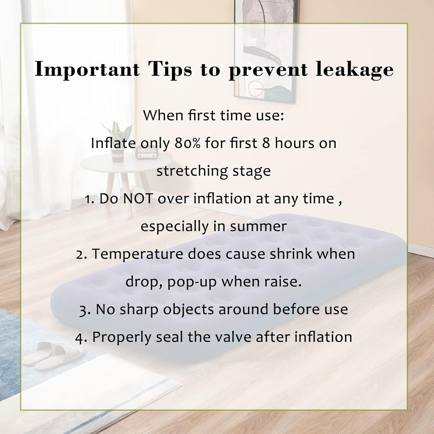 Tamaño ideal: mide 190,5 cm x 99,1 cm x 22,9 cm, este colchón acomoda cómodamente hasta 220 libras. (Excluyendo bombas inflables), por lo que es adecuado para la mayoría de las personas para usar. Material de larga duración: hecho de PVC de calidad superior y material flocado, este colchón ofrece una gran durabilidad y comodidad, por lo que es perfecto para el uso regular. Fácil instalación: el colchón se puede inflar fácilmente en cuestión de minutos con una bomba de aire, y se desinfla rápidamente para un fácil almacenamiento, ahorrando tiempo y espacio. Uso versátil: ya sea que lo uses en casa o lo lleves contigo en tus viajes al aire libre, este colchón inflable es perfecto para acampar, senderismo y otras actividades que requieren una solución cómoda y portátil para dormir. Servicio al cliente: Si tiene algún problema después de recibir el producto, puede contactarnos en cualquier momento, seremos pacientes para resolver el problema por usted.