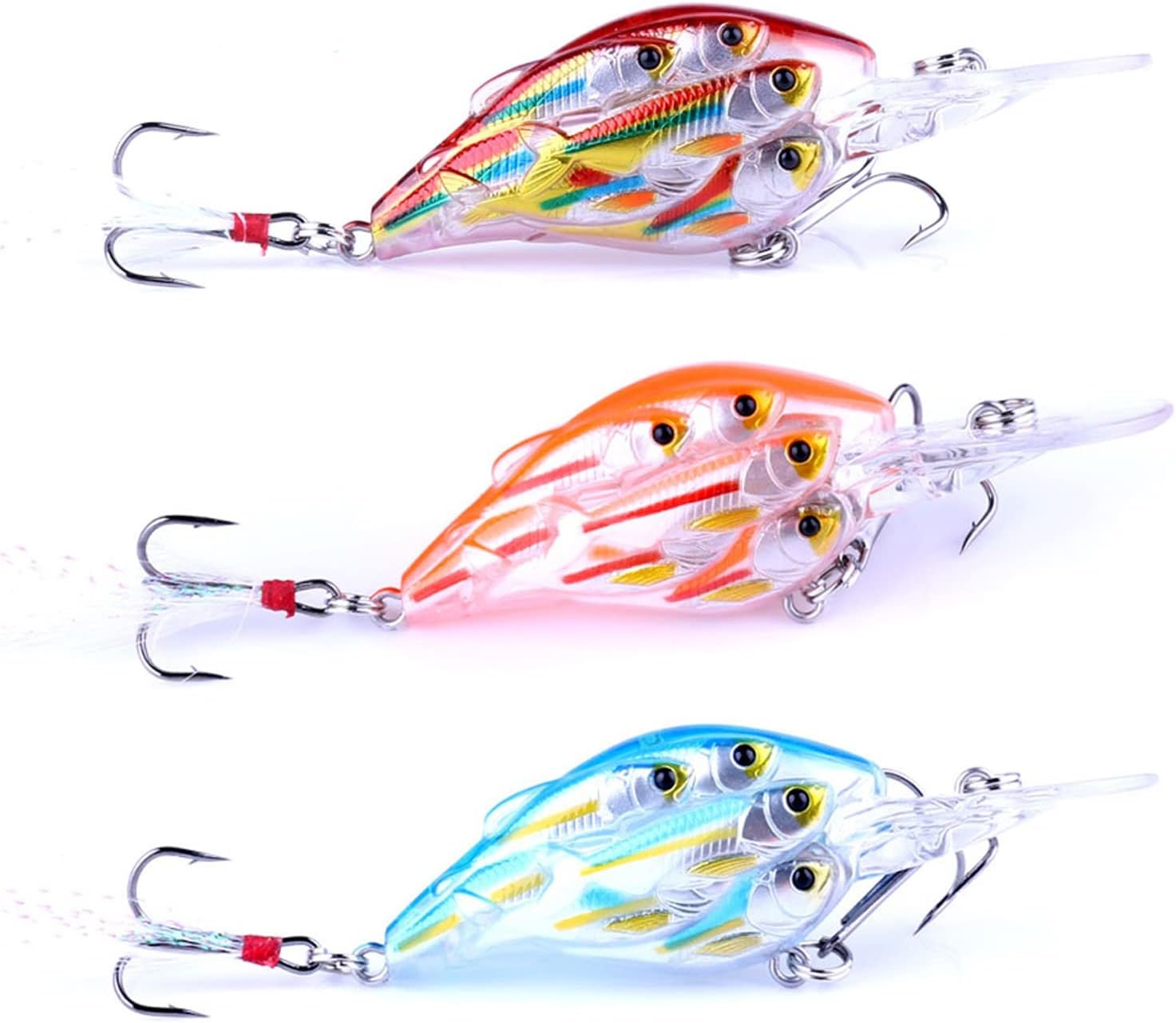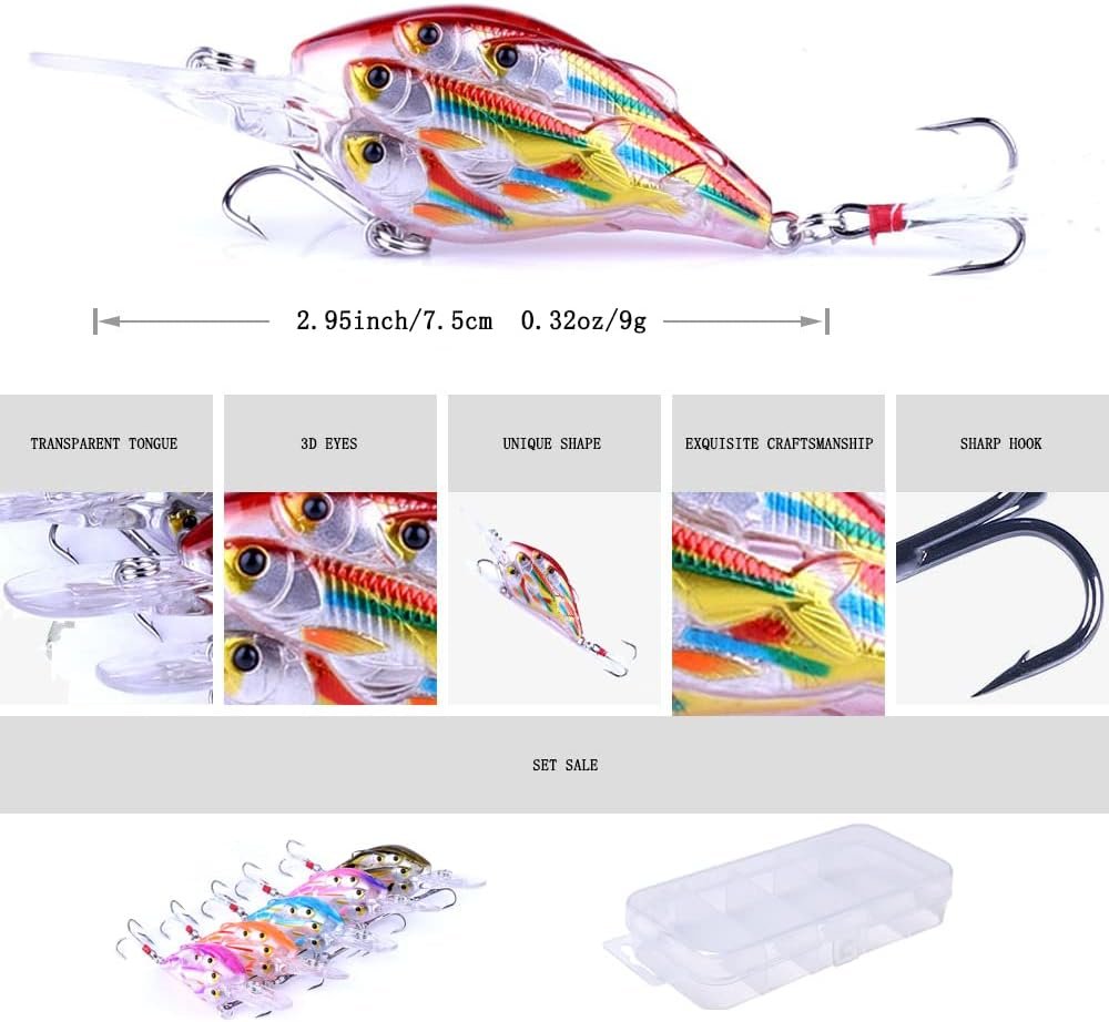 Longitud: 7,5 cm. Peso: 0.32 onzas. Color: cinco colores con diferentes estilos; paquete: 5 unidades/caja. Crankbaits es generalmente corto y gordo, pero curvilíneo y lleno de baches! Los labios de los cigüeñales suelen ser grandes y largos, por lo que al arrastrar, tienen un giro más grande y mucha vibración. El estilo de natación es particularmente coqueto, rascándose las caderas y torciendo sus caderas. Además, Crank tiene bolas de acero en el cuerpo que pueden emitir un sonido más fuerte. A menudo puede sumergirse profundamente en la zona enemiga para seducir al enemigo oculto, y puede jugar un efecto sorprendentemente ganador en cada capa de agua! Diseño de cuerpo completo 3D: ojos de pez biónico holográfico 3D y nunca se desvanecen con el revestimiento biomimético 3D, hacen que este cebo se vea más realista, se ve como peces reales, peces más atractivos. Estimular el impulso de los peces de buscar alimento y tentarlos a atacar activamente. Así que este es un cebo perfecto que puede engañar fácilmente al pez objetivo. La parte principal del material ABS de alta calidad, más duradero y resistente. Equipado con 2 tres ganchos de alta resistencia, que son extremadamente afilados y pueden penetrar en la boca del pez más rápido, y están equipados con púas para evitar que los peces se escapen. Todos los diseños están diseñados para que te sientas más cómodo y te permite tener una experiencia de pesca agradable. Adecuado para la pesca de peces carnívoros como lubina, trucha y lucio. Dependiendo de su operación, el cebo puede buscar en diferentes capas de agua. Es adecuado para todo tipo de aguas, ya sean ríos, lagos o el mar, haciendo que tu pesca sea más agradable.