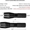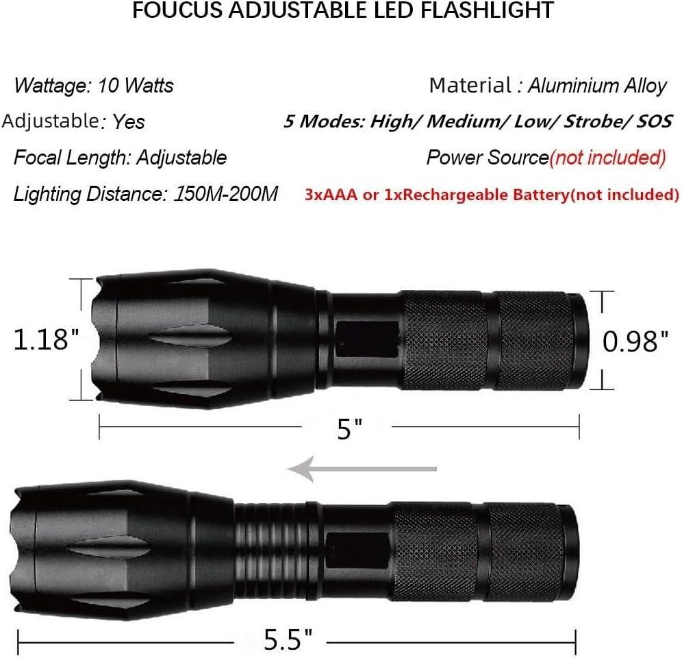 Súper brillante con 5 modos: el potente LED de alto lúmenes genera un reflector brillante de área grande o un foco perfectamente enfocado a una distancia de haz de 656 pies/656.2 ft. Enfoque ajustable con 5 modos: (alto, medio, bajo, estroboscópico, SOS/emergencia). Enfoque ajustable: enfoque ajustable para su uso en diferentes situaciones (solo gira el cabezal de la linterna para ajustar). La linterna LED te permite seleccionar el enfoque entre haces puntuales y de inundación. Impermeable y de alta calidad: la linterna es impermeable y está hecha de aleación de aluminio y goma. Corteza de aleación de aluminio duradera, resistencia a la abrasión. Ampliamente utilizado: fácil de llevar contigo como respaldo y es lo suficientemente pequeño como para caber en tu bolsillo, bolso, cajón o compartimento del automóvil. Toma 3 AAA estándar o una sola recargable. No se incluyen baterías de litio. Lo que obtendrás: 2 linternas LED, 2 tubos de batería, 2 soportes de batería AAA (pilas no incluidas) y 2 cordones (correas de mano).