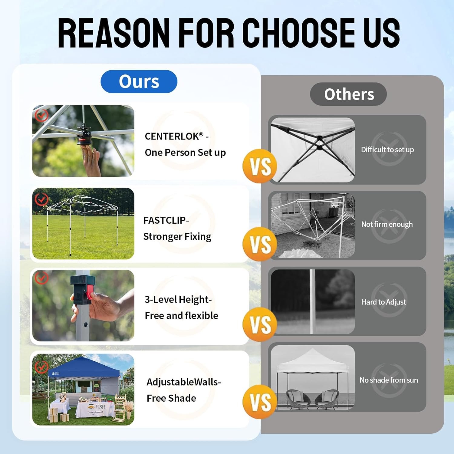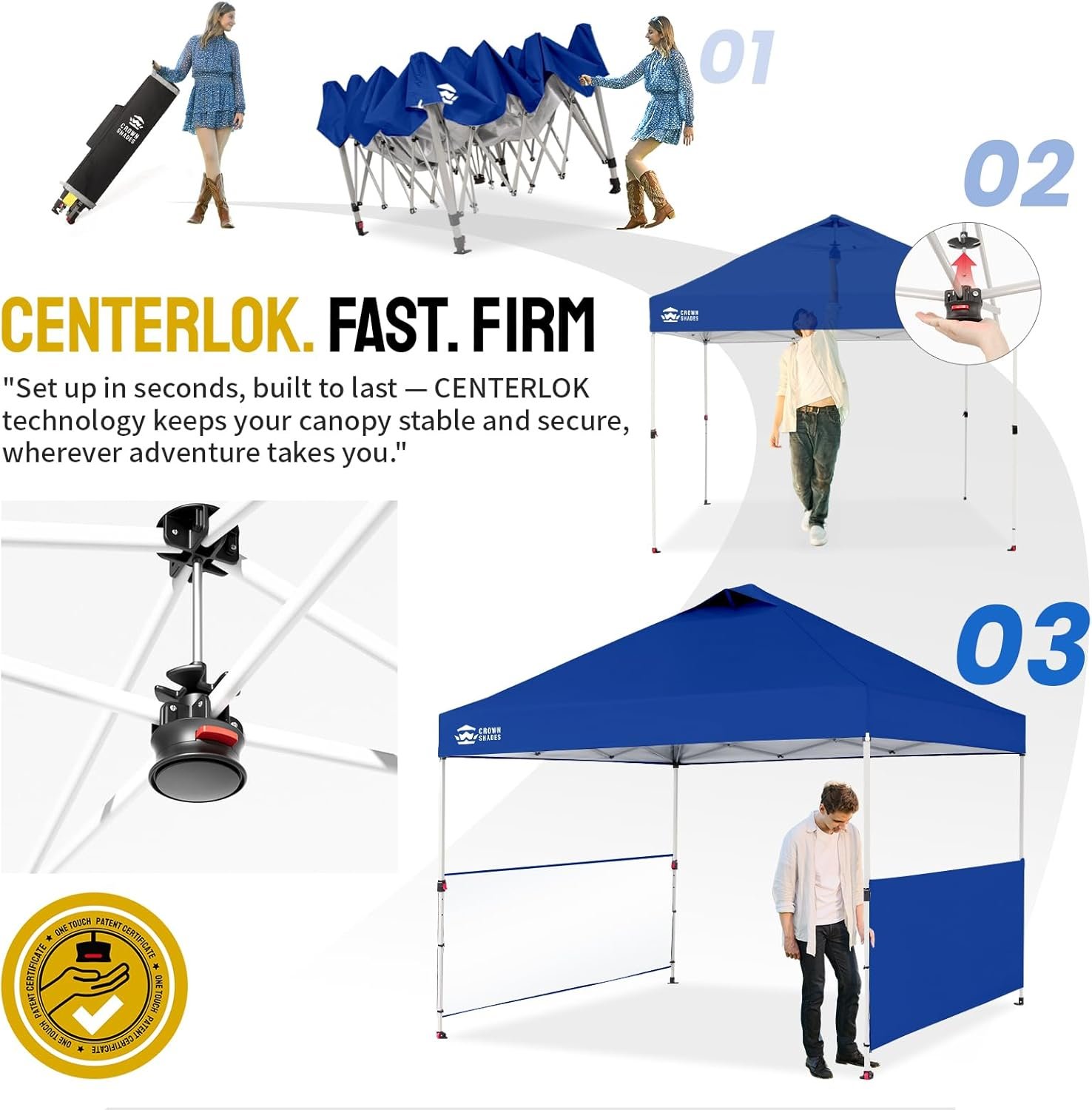 [Configuración más fácil]: tecnología patentada de bloqueo central de un solo empuje: el cubo central bloquea las cuatro patas con un solo empuje. Luego utiliza los botones suaves sin pellizcos para ajustar la altura de la pierna. Toldo de próxima generación diseñado para que dos personas puedan instalarlo en segundos sin necesidad de herramientas. [GRAN ESPACIO]: huella del dosel de 10 x 10 pies con 100 pies cuadrados de sombra. Altura interior máxima de más de 9 pies y 10,2 cm, y más de 6 pies de distancia máxima debajo de la cenefa. Mucho espacio de pie, y 10 personas pueden sentarse cómodamente en la sombra fresca. [Tela mejorada]: tela resistente con revestimiento plateado 150D que proporciona protección UV UPF 50+. La tela resistente al fuego con clasificación CPAI-84 es repelente al agua e incluye cinta de sellado impermeable para proteger contra la acumulación de agua en condiciones húmedas. El color se verá grisáceo debido al revestimiento plateado. Construcción del marco: armadura de acero resistente a la corrosión de alto grado duradero con pernos endurecidos está preensamblado y se puede instalar sin herramientas. Construido para soportar hasta 120 libras. distribuido a través del marco. Las dimensiones de almacenamiento son 121,9 cm x 20,3 cm x 20,3 cm. Incluye: bolsa Sto’N Go para un fácil transporte y tamaño de almacenamiento compacto que se adapta a la mayoría de los vehículos. La bolsa cuenta con un bolsillo especializado para las 8 estacas incluidas, 4 cuerdas tensoras, 2 medias paredes laterales extraíbles y 4 bolsas de peso vacías. [NOTA]: NUNCA deje su refugio desatendido. Los toldos se volarán o colapsarán con fuertes vientos o lluvias, incluso cuando estén correctamente anclados. Siempre derriba cuando se acerca una tormenta. Cuando esté en uso, siempre ancla tu toldo con las estacas incluidas y las cuerdas tensoras para evitar daños. [NUESTRA PROMESA]: ¡Experimente nuestro increíble servicio al cliente! Estamos aquí para apoyar su dosel. Estamos disponibles las 24 horas del día para ayudar a corregir cualquier problema o pregunta que pueda tener con nuestros productos Crown Shades.