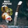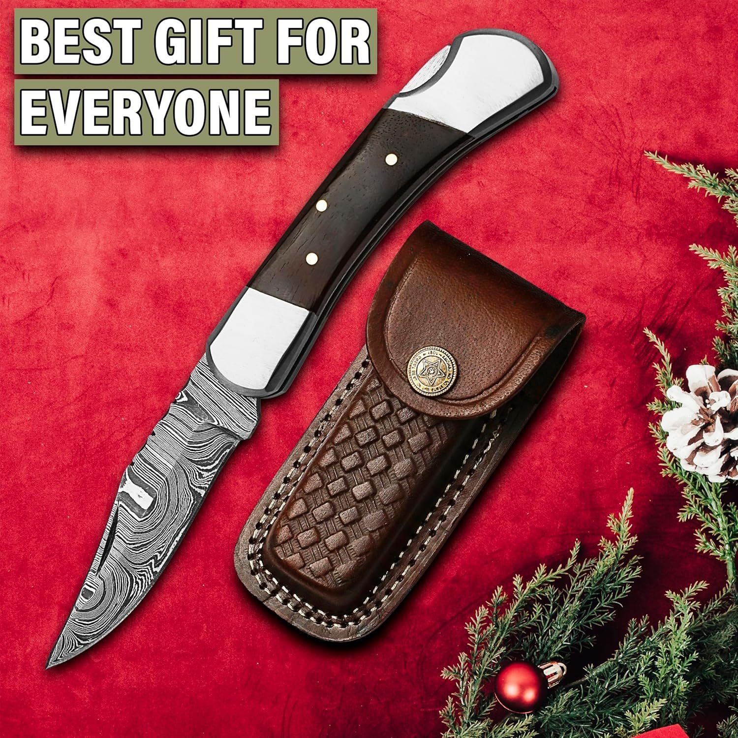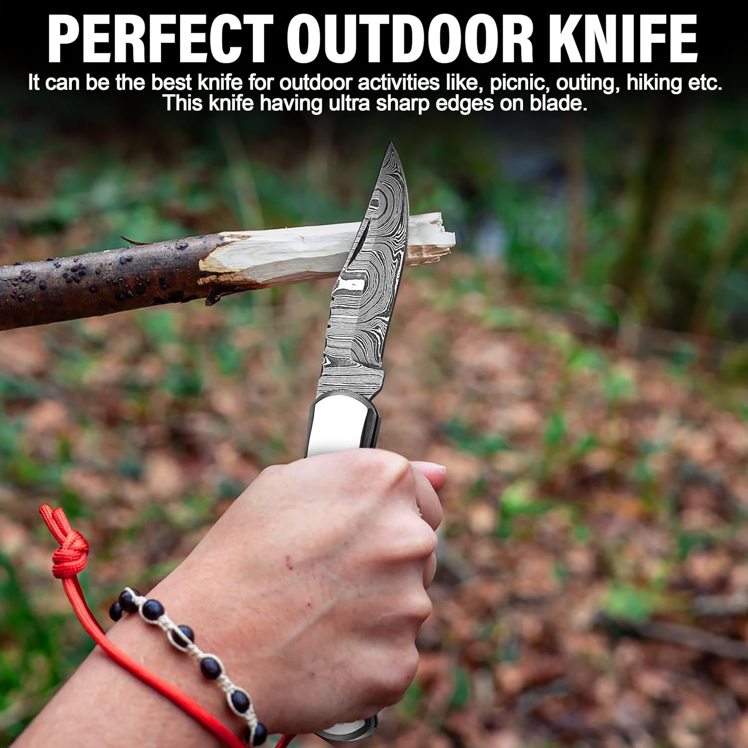 Hoja de acero de damasco de alta calidad: hecha de acero de Damasco de alta calidad, nuestra navaja de bolsillo es reconocida por su durabilidad, resistencia y patrón único, asegurando un rendimiento confiable para diversas actividades al aire libre. Mango de madera Pakka de 10,2 cm: cuenta con un mango hecho de hueso de camello genuino, nuestra navaja de bolsillo para hombre proporciona un agarre ergonómico y añade un toque de elegancia al diseño del cuchillo. Diseño plegable para portabilidad: se pliega cómodamente a un tamaño compacto, lo que hace que el cuchillo de caza plegable de damasco con funda sea fácil de llevar en bolsillos, mochilas o fijar a cinturones, perfecto para aventuras al aire libre como caza, pesca y senderismo. Uso versátil y multiusos: nuestros cuchillos de bolsillo y cuchillos plegables están diseñados para una amplia gama de tareas, incluyendo desollar, aderezar el campo, filetear pescado, cortar cuerda y otras tareas diarias al aire libre, lo que hace que el cuchillo de supervivencia sea una herramienta versátil para cualquier actividad al aire libre. Estética elegante y elegante: el patrón único de nuestros cuchillos para hombre de acero Damasco combinado con la textura natural del hueso de camello crea una apariencia visualmente impresionante y distintiva, haciendo que el cuchillo de camping sea una pieza destacada en cualquier colección.