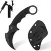 Cuchillo Karambit resistente: este cuchillo táctico de karambit cuenta con una hoja curvada de espiga completa de estilo garra hecha de acero inoxidable 420C, que ofrece una excelente retención de bordes, resistencia a la corrosión y un rendimiento confiable para la supervivencia al aire libre, la autodefensa y las tareas diarias. Dimensiones de la hoja fija Karambit: longitud total 18,0 cm, con longitud de hoja 7,1 cm, longitud del mango 9,9 cm, pensamiento de la hoja: 0,5 cm, longitud de la vaina: 13,2 cm, peso total del cuchillo solo 0.585 libras. Agarre cómodo: el mango G10 de diseño ergonómico ofrece una excelente dureza y resistencia a la corrosión, proporcionando un agarre cómodo, agarre seguro y fácil manejo. Este cuchillo de garra tiene un anillo en el mango para facilitar el agarre hacia adelante y hacia atrás. Cuchillo EDC versátil: un cuchillo compacto y confiable de hoja fija edc que es perfecto para el transporte diario. Ya sea que estés haciendo senderismo, acampando o sobreviviendo al aire libre, siempre está listo cuando lo estés. Múltiples opciones de transporte: incluye una funda Kydex ligera con un clip universal que permite un transporte horizontal o vertical. Los espaciadores ajustables te permiten ajustarlo a casi cualquier tamaño de cinturón, lo que hace que este cuchillo sea fácil de llevar donde quiera que vayas.