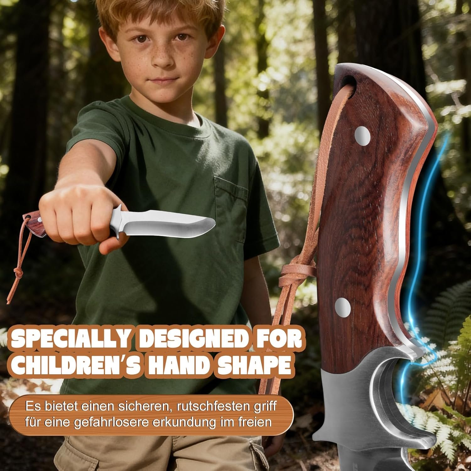 Diseño seguro para niños: este cuchillo para niños tiene una punta redondeada y un protector de dedo para mayor seguridad, por lo que es una opción confiable entre los cuchillos para niños. Perfecto como primer cuchillo para niños para aprender habilidades al aire libre. MATERIALES Y FUNDA PREMIUM: Hecho de acero inoxidable 3Cr13MoV con un mango de madera, este cuchillo para niños viene con una funda de cuero y un trabilla para cinturón. Ideal para cuchillos infantiles en bushcraft o camping, una opción sólida de cuchillos para niños. Uso en campamento y exteriores: un cuchillo versátil para niños para preparación de alimentos, artesanía en madera y supervivencia básica. Destaca entre los cuchillos para niños y funciona como prácticos cuchillos para niños para el aprendizaje al aire libre. Mango ergonómico: el mango de madera se adapta a manos pequeñas, lo que hace que este cuchillo para niños sea seguro y cómodo. Uno de los cuchillos infantiles más prácticos para acampar y explorar, ideal en colecciones de cuchillos para niños. Regalo para jóvenes exploradores: duradero y listo para la aventura, este cuchillo para niños es la mejor opción entre los cuchillos para niños y un maravilloso regalo de cuchillos para niños. Aviso de seguridad: este cuchillo para niños está diseñado con características de seguridad como una punta redondeada y un protector de dedos. Sin embargo, sigue siendo una herramienta real, no un juguete. Los niños solo deben usar este cuchillo bajo supervisión directa y continua de un adulto. Nunca deje el cuchillo con los niños sin supervisión.