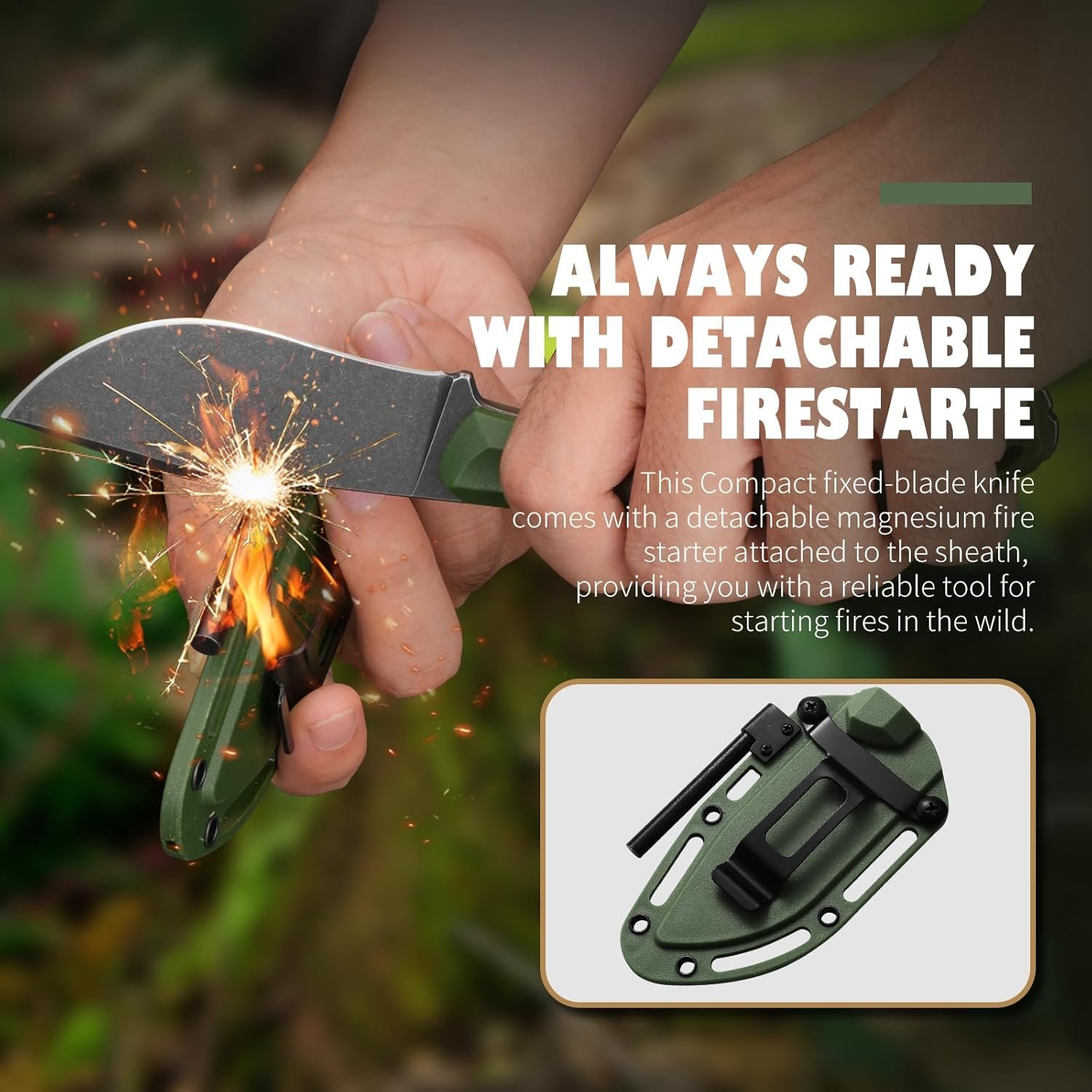 CUCHILLA DE ACERO INOXIDABLE DURADERO 5Cr13Mov: Este pequeño cuchillo de supervivencia está hecho de acero inoxidable 5Cr13Mov de alta calidad, conocido por su resistencia a la corrosión, afilado y retención de bordes, lo que lo hace perfecto para tareas difíciles al aire libre como cortar, cortar y cazar. ARRANQUE DE FUEGO INCLUIDO: Este pequeño cuchillo EDC de hoja fija viene con un iniciador de fuego, por lo que es una herramienta esencial para acampar, senderismo o situaciones de supervivencia, lo que le permite iniciar un incendio incluso en condiciones difíciles. Construcción de espiga completa: diseñada para mayor durabilidad y resistencia, la construcción de espiga completa garantiza que la hoja se extienda a través de todo el mango, proporcionando el máximo soporte y fiabilidad para las tareas. Mango ergonómico: el mango cómodo ofrece un agarre ergonómico y antideslizante para un manejo seguro en todas las condiciones climáticas y garantiza comodidad durante el uso prolongado Compacto y fácil de transportar: con una longitud total de 20,9 cm, este cuchillo compacto de hoja fija viene con un clip para cinturón para un transporte cómodo, asegurando que siempre esté al alcance durante tus aventuras al aire libre.