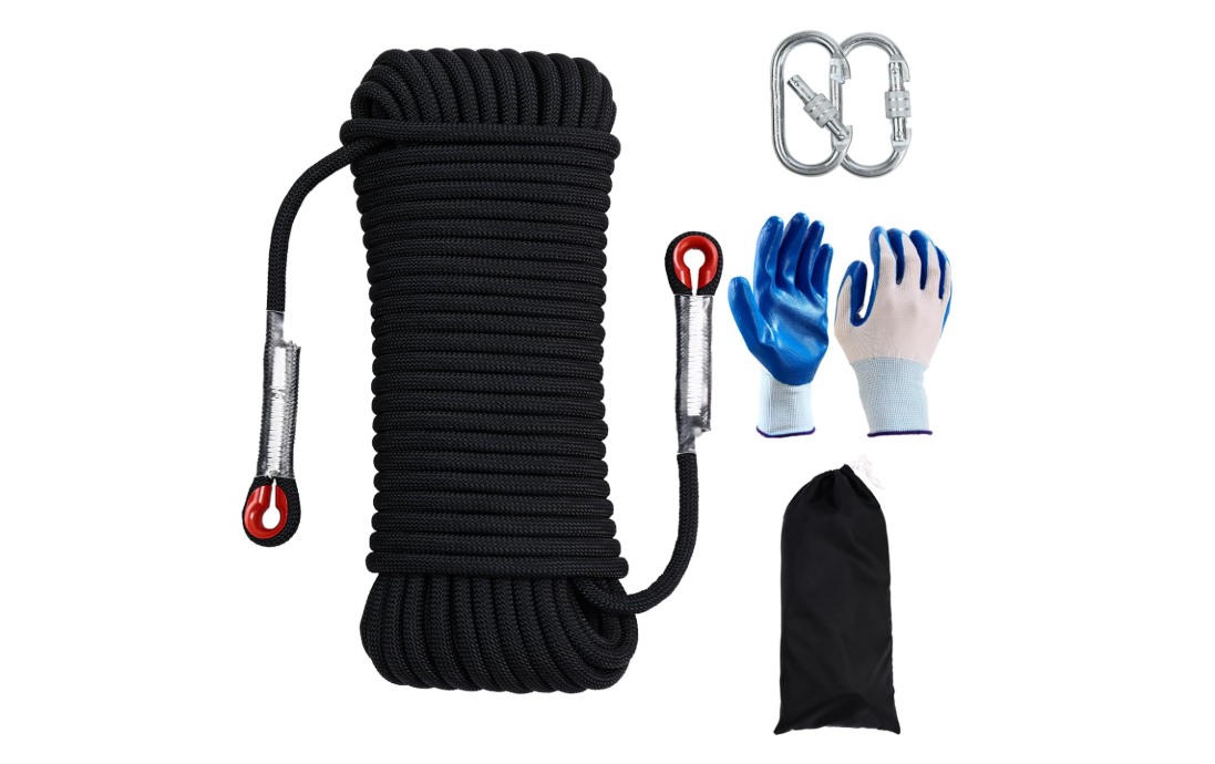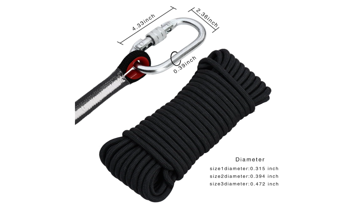 - Contenido del paquete: cuerda de escalada estática de 98 pies x 0.315 in, 1 guante antideslizante de goma, gancho profesional de montañismo (peso máximo: 25KN) x 2, 1 bolsa de cuerda.