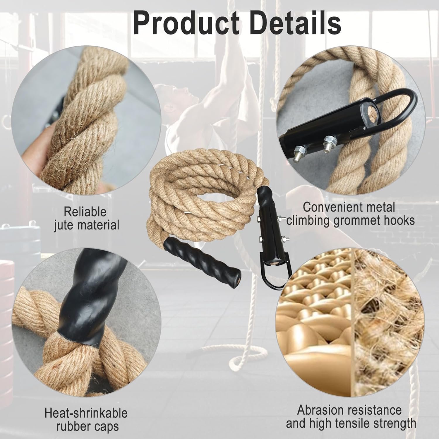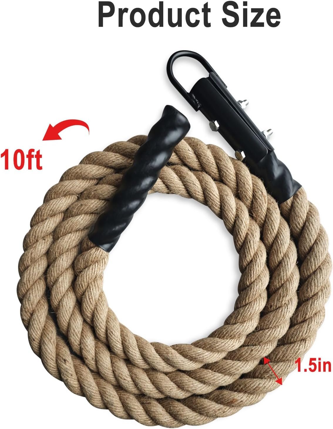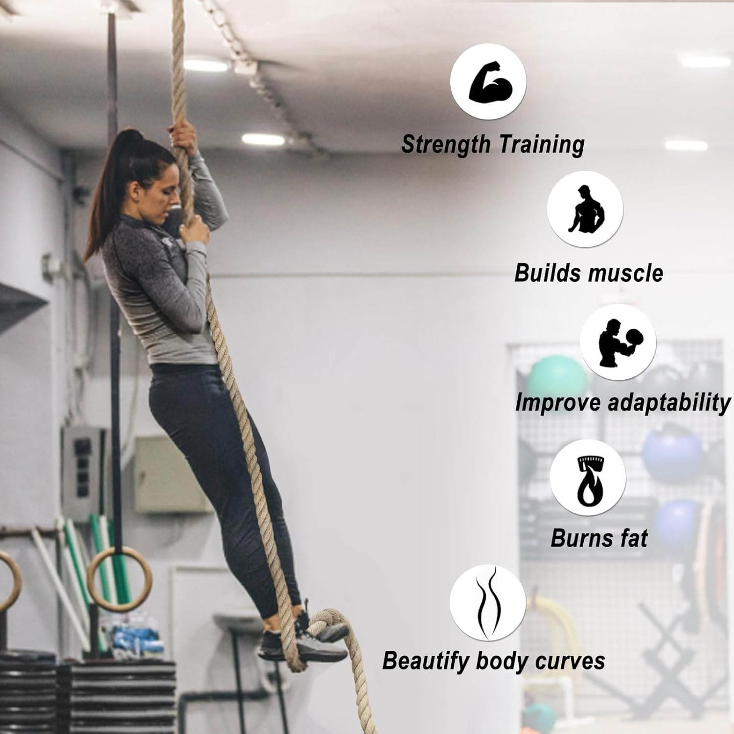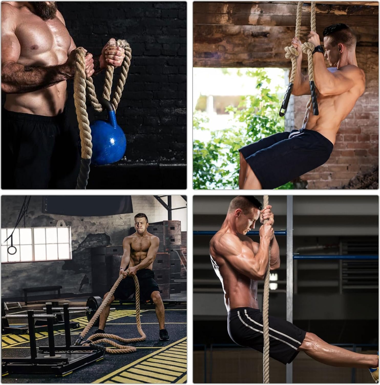 Material de la cuerda de cáñamo natural duradera: nuestras cuerdas de escalada están hechas de material de cáñamo natural de alta calidad para garantizar una durabilidad y agarre superiores, así como resistencia a la abrasión y un tacto suave para mantener tus manos libres de ampollas incluso después de largas horas de uso. Diseño de alta tracción: esta cuerda de escalada de 3,8 cm de diámetro está diseñada para tener una alta resistencia a la tracción con un peso máximo de soporte de 500 libras. Ya sea que estés escalando o realizando ejercicios de fuerza, garantiza la fiabilidad durante los entrenamientos más desafiantes. Recomendado para uso en interiores en ambientes secos para evitar el contacto con la humedad y el agua. Herramienta de entrenamiento multifuncional: esta cuerda de escalada es perfecta para una amplia gama de actividades de fitness, como escalada en roca interior, entrenamiento de fuerza, dominadas de un brazo, extensiones de brazo y más. Capaz de ejercicios de construcción de fuerza, proporciona un entrenamiento de tonificación muscular para todos los niveles de fitness. Una adición versátil a tu programa de fitness en casa o en el gimnasio. Fácil de transportar y almacenar: esta cuerda de escalada está diseñada para ser flexible, fácil de transportar y fácil de almacenar, se puede enrollar y transportar fácilmente cuando no está en uso, perfecta para entusiastas del fitness que quieren entrenar sobre la marcha. Satisfacción garantizada: Prestamos atención a la experiencia de compra de cada cliente, si tiene alguna pregunta sobre nuestros productos, póngase en contacto con nosotros, le responderemos lo antes posible