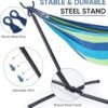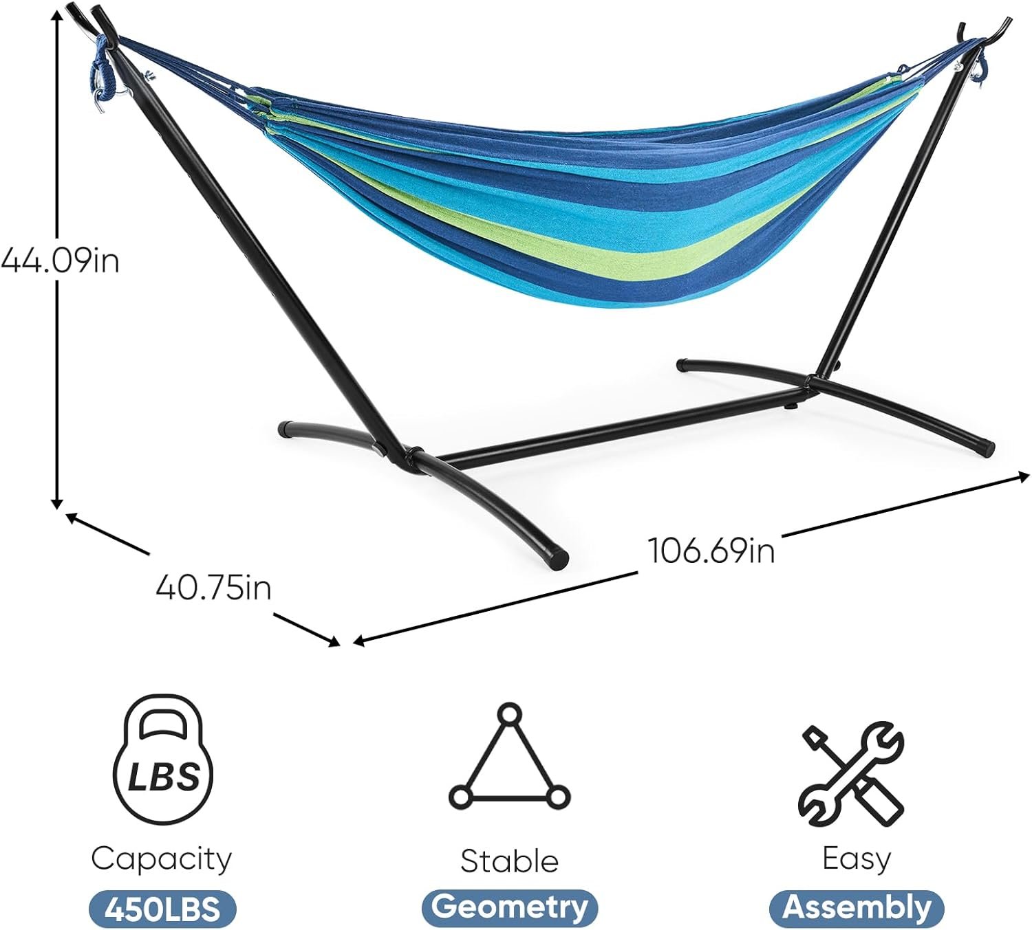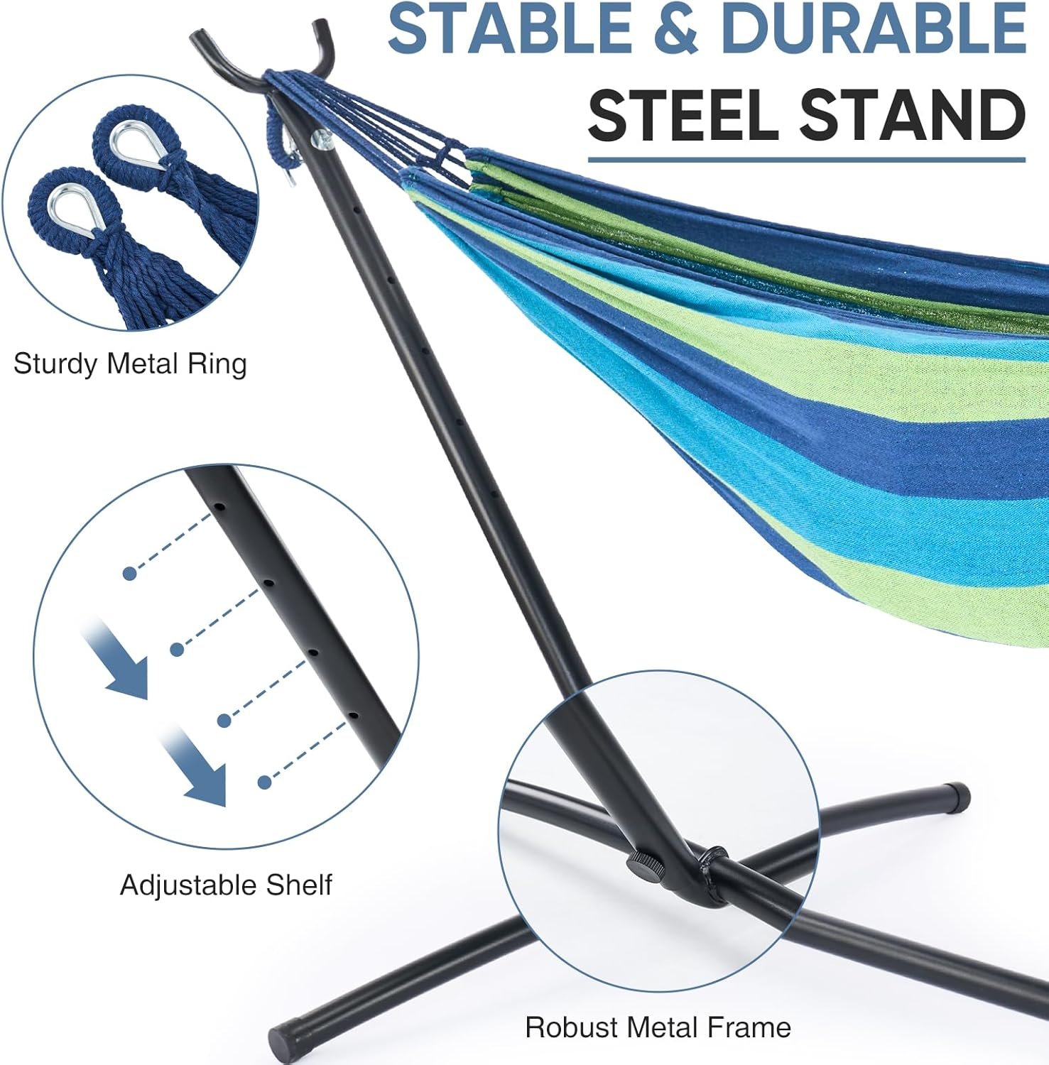 Resistente y confiable : Disfruta de la libertad de relajarte en cualquier lugar con la hamaca de alta resistencia, ¡no se requieren árboles! Soporta hasta 450 libras, asegurando una estabilidad duradera para ti y un amigo. Comodidad vibrante y transpirable : Sumérgete en la tela suave y agradable al tacto, diseñada para la máxima comodidad. Los colores vibrantes añaden un toque de estilo, mientras que el tejido transpirable te mantiene fresco en días cálidos. Configuración rápida y sin herramientas: pasa menos tiempo montando y más tiempo relajándote. La hamaca y el soporte se instalan en minutos, no se necesitan herramientas. Simplemente despliegue, conecte y desenrolle. Lleva la relajación a cualquier lugar : perfecto para acampar, viajes a la playa o descansar en el patio trasero. La bolsa de transporte incluida hace que el transporte sea muy fácil. Ya sea que se dirija al parque o a la orilla del lago, su acogedor refugio lo acompaña. Diseño suave y seguro: el tubo de acero cuenta con tapas de plástico protectoras para evitar arañazos y mantener las superficies seguras, mientras que las costuras reforzadas y los ganchos de metal garantizan una larga durabilidad.