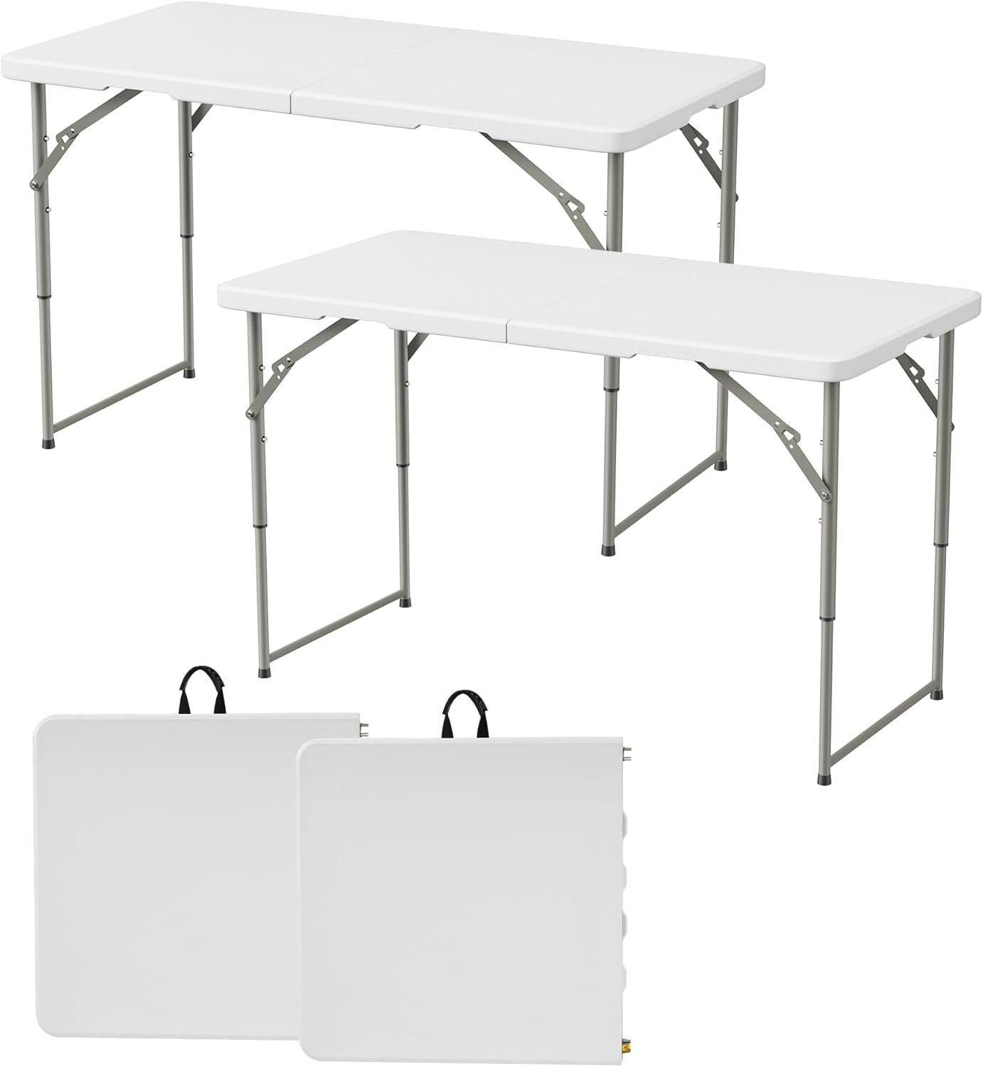 Mesa plegable resistente: construida con patas de acero resistente y una mesa de plástico de polietileno, esta mesa plegable soporta cargas pesadas para un uso confiable y duradero en una variedad de condiciones. Utilízala como una mesa de camping para terrenos accidentados o como una espaciosa mesa de picnic para reuniones familiares Diseño plegable: mecanismo de bloqueo plegable sin costuras y mango ergonómico que hacen que la mesa plegable sea fácil de transportar con una mano, ideal para aventuras al aire libre, fiestas de portón trasero o configuraciones interiores instantáneas Mesa de picnic que ahorra espacio: amplia superficie de 4 pies (119,9 cm x 59,9 cm) con ajustes de altura de 3 posiciones (47,0 cm, 62,2 cm, 74,9 cm) que proporciona mucho espacio para cenar, jugar, estar de pie o descansar. La mesa es resistente al agua y a las manchas con un paño limpio, por lo que es imprescindible para almuerzos junto al lago, barbacoas en el patio trasero o proyectos desordenados de bricolaje Mesa de camping multiusos: mejora tu experiencia al aire libre con esta versátil mesa plegable de 4 pies que se puede utilizar como estación de cocina, mesa de juego o área de comedor. El diseño compacto y ligero se pliega fácilmente para almacenamiento y transporte para adaptarse a una tienda de campaña, RV o balcón de apartamento Mesa plegable para espacios pequeños: la mesa grande de 4 pies tiene capacidad para 4 personas. Primera opción para apartamentos pequeños, eventos de vacaciones o asientos temporales para invitados