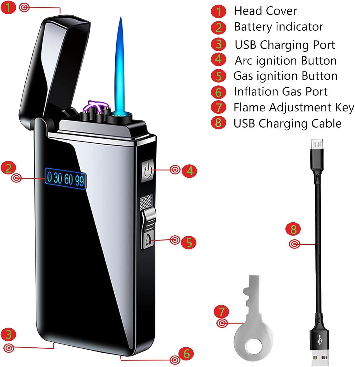 Exquisito encendedor de llama y encendedor de arco Este encendedor fresco utiliza aleación de zinc de alta calidad y placa de cerámica resistente a altas temperaturas, superficie lisa, sensación cómoda al tacto, fuertemente resistente al desgaste y lo suficientemente duradero para un uso duradero, su peso de aproximadamente 3.00 oz, tamaño de aproximadamente 3,8 cm x 1,5 cm x 7,9 cm (largo x ancho x alto), por lo que se puede poner fácilmente en tu bolso o bolsillo y no ocupe demasiado espacio. ace.upward electrodo La tapa abierta ofrece un aspecto clásico con un toque moderno. Dos métodos de encendido más ligero Combina perfectamente el encendedor de antorcha de butano y el encendedor de plasma en uno. Uno es una llama azul fuerte, este modo de fuego te da una superficie más amplia que no tiene problemas para encender objetos en tamaño grande, el otro es recargable que puedes utilizar cable USB, adopta la tecnología de plasma mejorada, generada por electricidad, encendedor de doble arco, velocidad de encendido 3-5 veces más rápida que la electrónica de un solo arco. más ligero, puede ser fácilmente cigarrillos encendidos, velas, papel y etc. Encendedor de diseño resistente al viento El encendedor tiene una potente llama y doble arco fuerte (2 modos pueden elegir), el fuerte arco dual fácilmente contra cualquier brisa, funciona bien incluso en condiciones de viento, puede proteger eficazmente el arco eléctrico de ser soplado por un viento fuerte o cualquier entorno de clima húmedo. El encendedor de llama azul es visible al sol, especialmente para actividades al aire libre en interiores como cocina, senderismo o barbacoa, velas, puros, puros. cigarrillos y fuego funciona. Recargable por USB e indicador de batería Puedes cargar este encendedor frío con un cable micro USB estándar en cualquier dispositivo que sea compatible con puerto USB, como computadora, laptop, banco de energía y adaptadores, etc. El encendedor de plasma requiere unos 40-60 minutos para una carga completa a través del cable USB que suministramos, el ciclo de batería de alta calidad dura de 300 a 500 cargas. Tiene cuatro luces LED con pantalla de batería, te recordará cuando necesites cargar el encendedor en cualquier momento. útil y conveniente. Lo que obtienes 1 encendedor de antorcha y encendedor de arco (2 en 1), 1 cable de carga USB, 1 herramienta de ajuste de butano, 1 caja de regalo elegante. Este es probablemente un regalo perfecto para cumpleaños, aniversario, Acción de Gracias, Navidad, Año Nuevo, Día de San Valentín, amigos, familia, pareja, negocios y mucho más. (Nota: durante el encendido, habrá el ruido de cmzee, zee cm, que es la generación de energía de alto voltaje, no te preocupes por eso, el encendedor se envía sin gas debido a la regulación del correo aéreo)