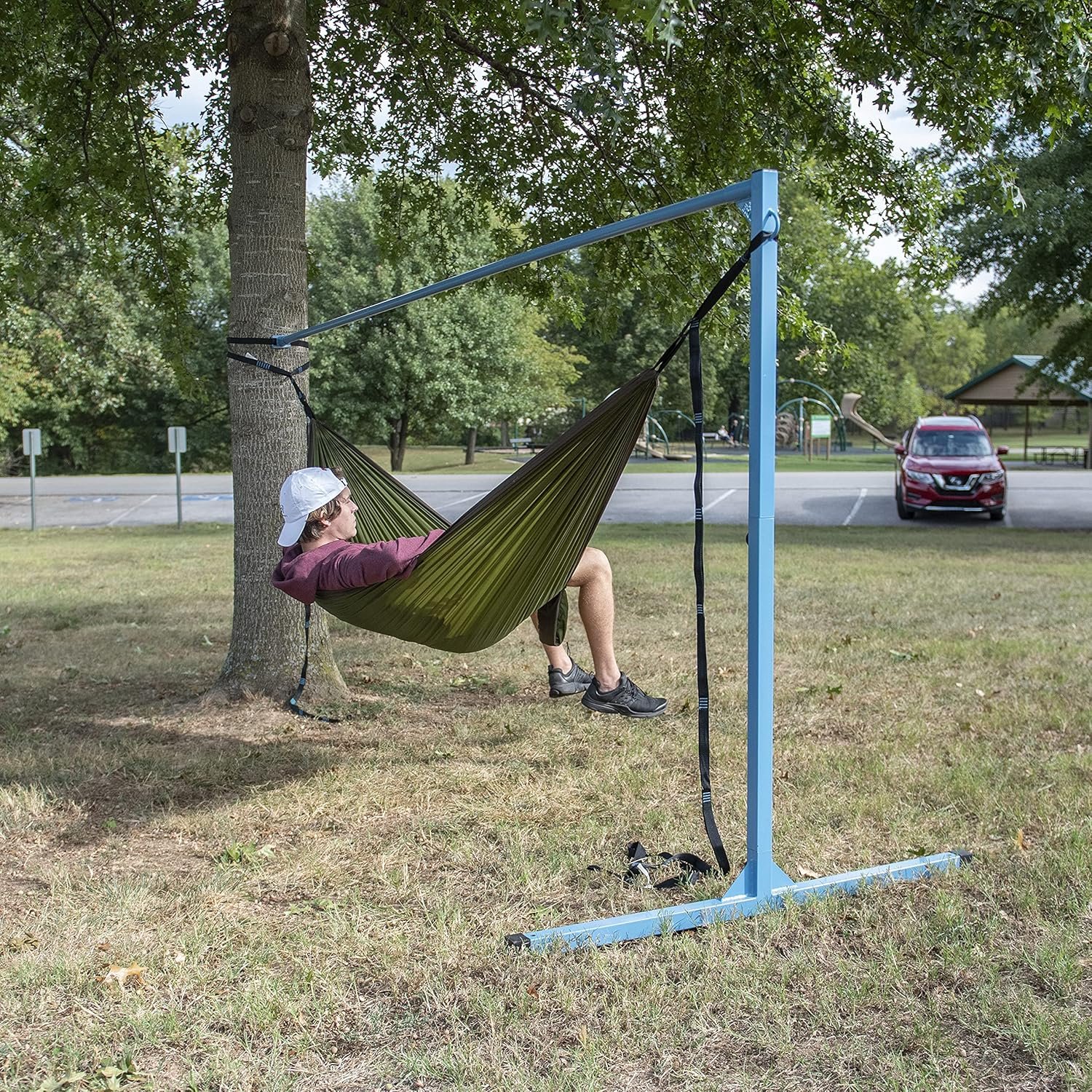 Libertad para hacer hamacas cómodamente en cualquier lugar: el soporte de hamaca Equip de un solo punto te da la libertad de hamaca en cualquier lugar donde solo tengas 1 árbol. Disfruta de este soporte de hamaca portátil en piscinas, festivales, parques o incluso en tu propio patio trasero. Una gran opción para combinar con una hamaca de campamento en un campamento. Soporte de hamaca portátil: este soporte de hamaca portátil se pliega convenientemente e incluye una correa para conectarse al árbol, y una bolsa de transporte para un fácil almacenamiento y transporte. La bolsa de transporte incluida hace que sea fácil llevar este soporte de hamaca portátil a cualquier lugar. Configuración fácil y sencilla: todo lo que necesitas para la configuración está incluido, por lo que no necesitas herramientas adicionales. Elija un lugar nivelado y siga las instrucciones para relajarse en minutos. La hamaca se vende por separado. Combínalo con la hamaca de campamento Equip y las correas de hamaca Equip Duradero y construido para durar: nuestros soportes de hamaca son 100% acero con recubrimiento en polvo. El único punto único está diseñado para ayudarte a hacer hamaca en cualquier lugar con solo 1 árbol. Incluye estacas de anclaje para mayor seguridad. Cuelga con un amigo: este fuerte soporte de hamaca de acero puede soportar hasta 400 libras. Disfruta con un amigo, pareja o tu mascota. Relájate con comodidad en cualquier lugar que estés en el soporte de hamaca Equip Bolsa de transporte y correa de hamaca de un solo punto incluida. Peso del soporte de la hamaca: 24.5 libras.