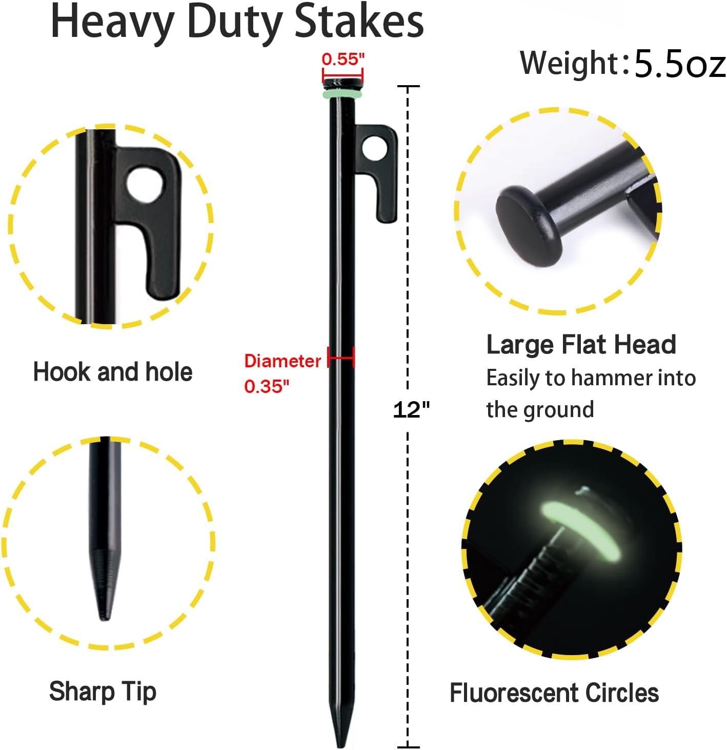 Kit de accesorios para tienda de campaña: recibirás 12 paquetes de estacas resistentes de 30,5 cm, 1 martillo profesional para estacas de tienda de campaña, 1 bolsa de almacenamiento. Te ayudan a instalar y desmontar la tienda fácilmente 12 estacas resistentes para tienda: nuestras estacas de metal para tienda de campaña están hechas de acero forjado S45C, cada una pesa 5.4 onzas, que son más duraderas, resistentes a romperse o doblarse, y funcionan fácilmente en superficies duras o rocosas, la cantidad a granel es suficiente para satisfacer tus necesidades Martillo multifunción: la cabeza del martillo está hecha de acero al carbono de alta calidad, que es fuerte y duradero. El gancho puede sacar fácilmente las estacas de la tienda del suelo, y está equipado con un cinturón fijo para evitar caídas accidentales, asegurando tu seguridad Bolsa de almacenamiento y anillos fluorescentes: la bolsa de almacenamiento está hecha de tela Oxford gruesa y reforzada 480D, resistente y duradera. Todas las estacas de tienda de campaña vienen con anillos de goma fluorescentes para proporcionar más visibilidad en entornos oscuros Ampliamente utilizado: el kit de herramientas de estacas de metal para tienda de campaña es perfecto para acampar al aire libre y viajes, pueden soportar fuertes vientos en prados, bosques, playas, nieve, desiertos, pastizales, gobi y otros entornos, y es ideal para asegurar lonas, toldos, tapetes de picnic, hamacas, etc
