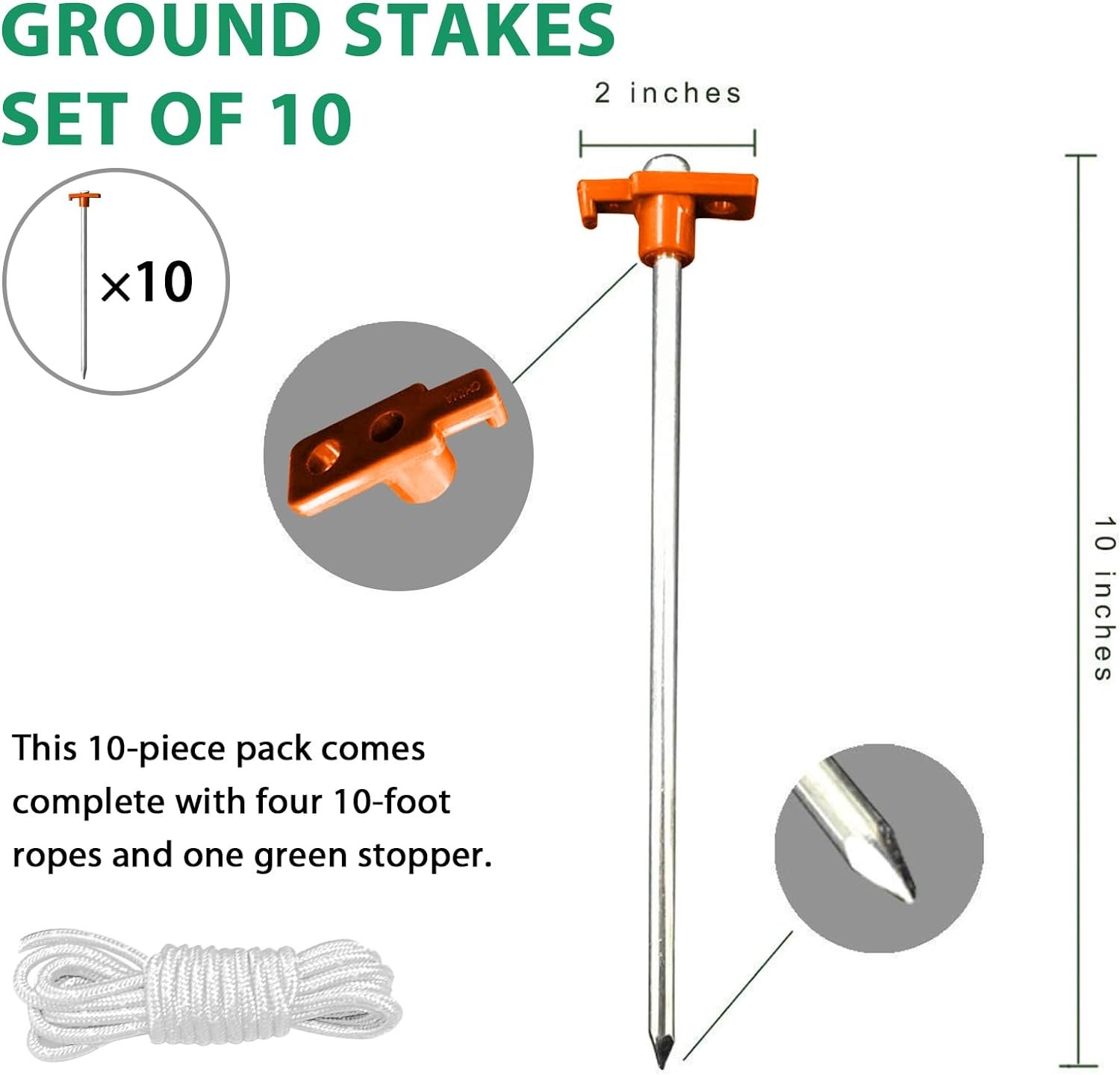 Acabado galvanizado antioxidante: el revestimiento galvanizado en estas estacas garantiza que permanezcan libres de óxido incluso después de la exposición a la lluvia y la humedad, garantizando una larga durabilidad. Juego completo: este paquete de 10 piezas incluye cuatro cuerdas de 10 pies y un tapón naranja, proporcionando todo lo que necesitas para asegurar tu tienda de campaña o refugio al aire libre. Fácil de usar: configurar tu tienda de campaña es sin esfuerzo con estas estacas de toldo diseñadas para una fácil instalación. Las cuerdas precortadas te ahorran tiempo y esfuerzo. Materiales de alta calidad: hechas de acero galvanizado, estas estacas ofrecen una resistencia confiable que no se dobla ni se rompe bajo presión. Visibilidad mejorada: el tapón brillante evita peligros de tropiezos y hace que sea fácil encontrar tus estacas de tienda. Ideal para camping, senderismo, picnics y salidas a la playa, estos anclajes resistentes proporcionan estabilidad en cualquier lugar.
