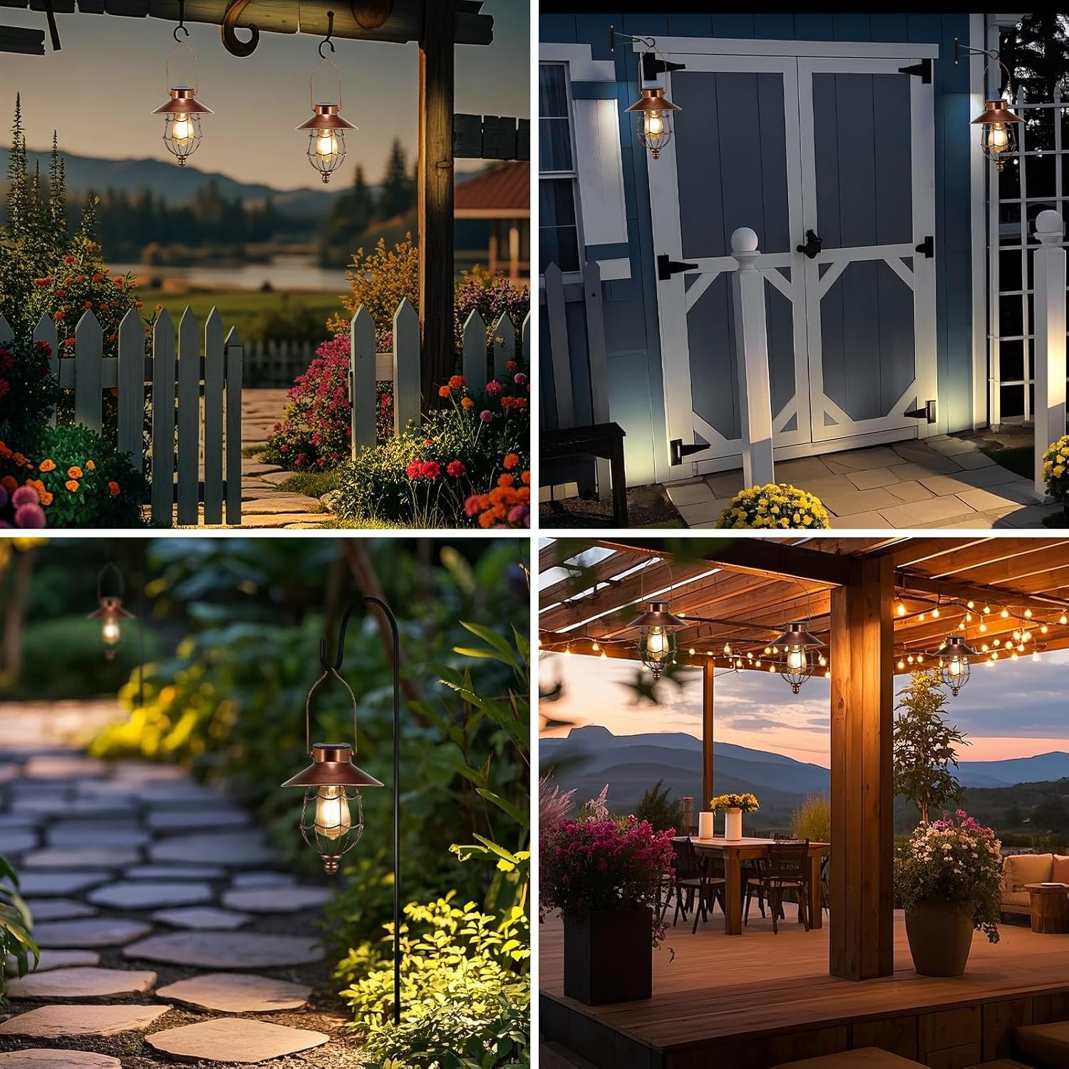 METAL Material y diseño retro: diseño vintage de paraguas de cobre, hecho de metal de alta calidad, bombilla LED Edison cálida reemplazable. Se ilumina automáticamente con poca luz. Hay un interruptor de encendido/apagado en la cubierta de la luz, asegúrate de girar el botón a la posición ON antes de cargar. Ahorro de energía: linternas solares con función de sensor de luz automático, la luz solar colgante se ilumina automáticamente por la noche y se apaga automáticamente durante el día. Después de una carga completa, las horas de trabajo pueden ser de hasta 8 horas. Resistencia a la intemperie: linternas solares para colgar al aire libre, diseño impermeable IP44, de acuerdo con la información reflejada por la mayoría de los clientes, el diseño impermeable se ha actualizado, y hay un anillo impermeable debajo del panel solar, adecuado para un entorno exterior a largo plazo. La pintura de bronce en el exterior de la bombilla evita el óxido. Ocasión adecuada Las linternas solares se pueden colgar en cualquier lugar que desees, perfectas para jardín, patio, patio, patio, porche, pared, camino, entrada, césped, camping, árboles, pérgolas, etc. iluminación solar al aire libre del paisaje y decoración. 100% garantía de satisfacción — si no estás satisfecho con nuestras luces solares colgantes por cualquier razón. Simplemente ponte en contacto con nosotros si alguna vez tienes problemas con tus luces colgantes de pearlstar