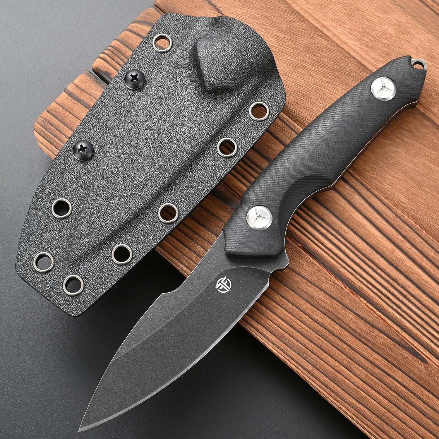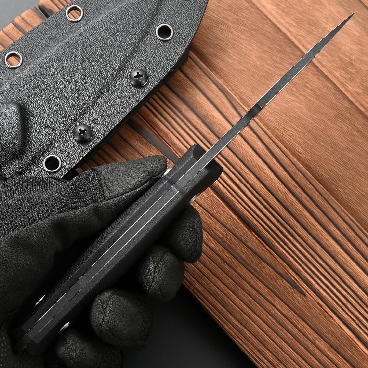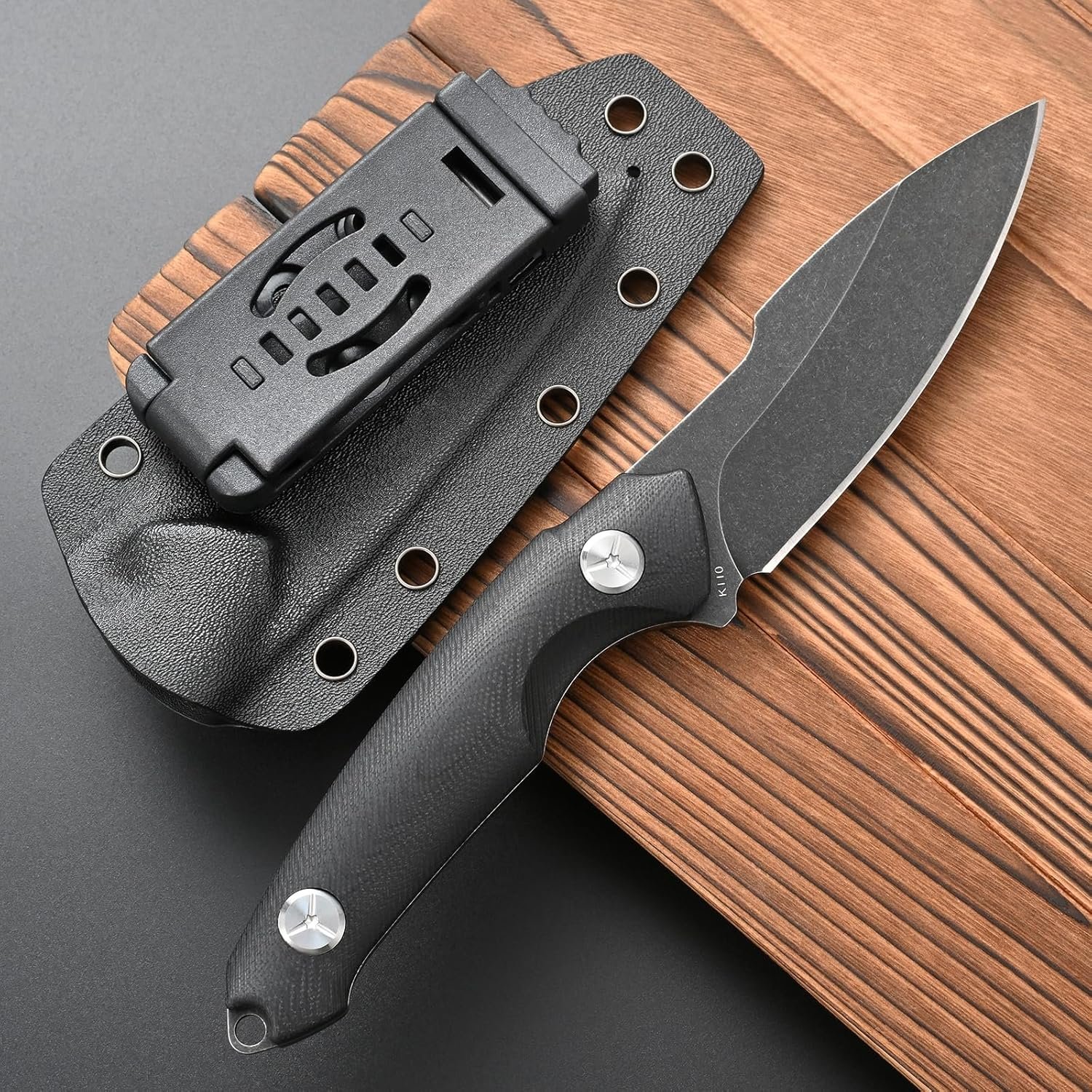Especificaciones del cuchillo de hoja fija: longitud total: 21,5 cm (8.5 in); longitud de la hoja: 12,0 cm (4.7 in); longitud del mango: 9,5 cm (3.7 in); ancho de la hoja: 3,0 cm (1.2 in); grosor de la hoja: 0.157 in; peso del cuchillo (peso neto): 6.3 onzas o 6.30 oz. Cuchillo de acero K110: Dureza duradera de la hoja de acero K110 59-61 HRC, proporciona afilado para el máximo rendimiento de corte de precisión con fuerte dureza y excelente retención de borde. Seguridad sólida: el mango texturizado G10 proporciona un agarre antideslizante, incluso en condiciones húmedas o duras. Cómodo y ergonómico: contorneado para una sensación natural en la mano, reduciendo la fatiga durante un uso prolongado. Durabilidad extrema: altamente resistente a la abrasión, la humedad y el impacto, lo que garantiza una fiabilidad a largo plazo. Aislamiento y seguro: material no conductor que protege contra peligros eléctricos. Experimenta un transporte seguro y cómodo al instante. Fabricada con Kydex ligero y de alta resistencia, esta funda cuenta con un cierre de clip rigurosamente mejorado e introduce opciones versátiles de transporte vertical. Está diseñado para una fiabilidad inquebrantable y acceso inmediato, asegurando que tu cuchillo esté siempre listo cuando lo estés. Potente cuchillo fijo: cuchillo fijo de construcción fuerte es adecuado para herramientas EDC y caza, pesca, camping, senderismo, jardinería, herramienta de electricista, vida en el campo, rescate de emergencia, aventura, colección y todas las actividades al aire libre y deportivas.