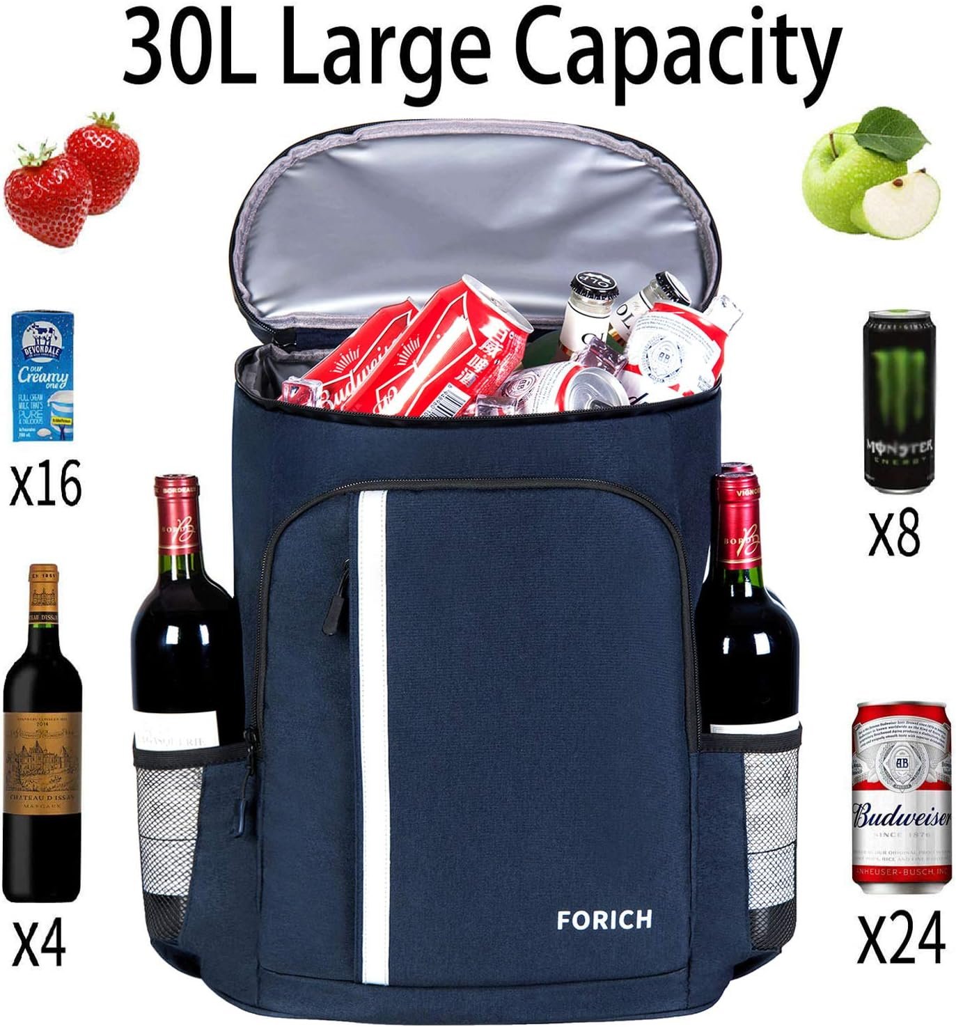 GRAN CAPACIDAD: 30 Latas/30L, Medidas: 46,0 cmx33,8 cmx20,1 cm. La mochila térmica térmica FORICH tiene suficiente espacio para todas tus necesidades. Mochila enfriadora a prueba de fugas: material grueso aislado interior mejorado y forro a prueba de fugas que retiene bebidas/alimentos fríos o calientes durante muchas horas y antifugas. El forro interior está hecho de excelente material mejorado y fácil de limpiar. Ligeras y duraderas: las hieleras de mochila grandes FORICH están hechas de tela resistente y duradera, nunca se rasgan, rasgan ni rayan, sino que también son ligeras. La cremallera de alta calidad es fácil de tirar sin problemas. Correas de hombro ajustables y diseño ergonómico con secciones acolchadas en la espalda para mayor comodidad y suavidad. Multiusos: la bolsa térmica suave impermeable de FORICH es un gran compañero para actividades al aire libre. No solo puede ser una mochila de picnic aislada, sino también una mochila enfriadora de playa, mochila de senderismo, mochila de camping, bolsa de pesca, mochila de viaje, etc. Múltiples bolsillos: 1 compartimento de almacenamiento a prueba de fugas aislado para bebidas o alimentos, 2 bolsillos grandes con cremallera en la parte delantera para tus artículos secos, y 1 bolsillo con cremallera en la tapa utilizado para organizar objetos pequeños, 2 bolsillos laterales de malla grandes que son el espacio perfecto para bebidas altas o botellas de agua. 1 abridor de cerveza y 1 bolsillo de malla para teléfono en la correa. Mochila hielera perfecta e impresionante
