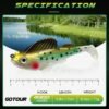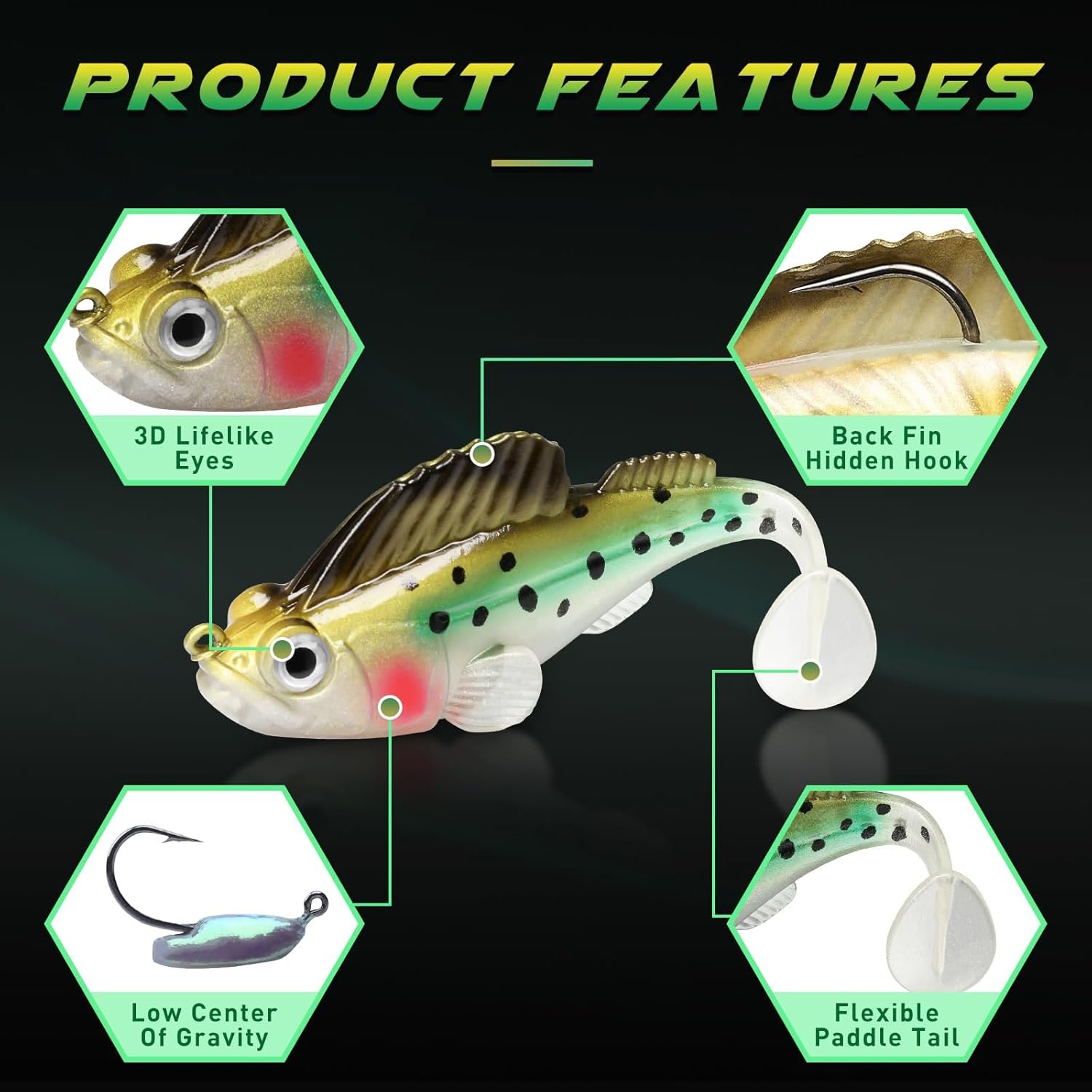 Diseño de gancho sin malezas: el gancho ultraafilado oculto en la aleta superior está diseñado para reducir posibles enganches y penetrar a través de todo tipo de cubierta. La aleta dorsal dividida suave no solo oculta el anzuelo, sino que hace que el cebo de pesca sea más realista. Atrapa más peces inteligentes ocultos en la hierba o el fondo fácilmente. Long Casting Jighead – Con un peso ideal para lanzamientos largos y hundimiento lento, los señuelos de pesca y plantillas para pesca de lubina pueden lograr una presentación lenta y aleteada. Con una forma de renacuajo de ingeniería biónica, los cebos de baño de plástico blando pre-aparejados tienen una gran acción de patada tanto a velocidades ultra lentas como a velocidades moderadamente rápidas. Acción de natación realista: los señuelos de bajo GOTOUR están equipados con cola de paleta 3D, ojos holográficos realistas y alambre sólido. El señuelo de pesca de lubina muestra una acción perfecta de patada sin importar a velocidad lenta o rápida, lo que resulta en una acción de natación muy atractiva. Material de plástico suave ultra duradero: hecho de material de plástico suave de alta calidad, los cebos de natación nunca se rompen incluso luchan con peces agresivos. El cebo de pesca tiene el equilibrio perfecto de durabilidad y biónica, que es un señuelo imprescindible en tu caja de aparejos de pesca. Ampliamente especies de pesca: ya sea que estés pescando en arrecifes, lagos, arroyos, ríos, agua dulce o agua salada, estos señuelos y señuelos suaves de lubina se convertirán en tus señuelos de pesca favoritos para atrapar lubina, crappie, trucha, lucio, snook, salmón, pez rojo, etc.