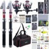 Kit de pesca con bolsa de transporte: este versátil conjunto combinado de pesca incluye todo lo que necesitas para una experiencia de pesca exitosa. El combo de pesca contiene 2 cañas de pescar telescópicas, 2 carretes de pesca giratorios, 2 líneas de pesca de monofilamento, 10 líderes de pesca, una alarma de mordedura de pesca, alicates de pesca, una pinza de pescado, una caja de aparejos con señuelos de pesca suaves, broches giratorios, anzuelos de pesca y algunos equipos de pesca necesarios, y una práctica bolsa de transporte Caña de pescar telescópica ligera: la caña telescópica está construida de fibra de carbono de alta densidad mezclada con fibra de vidrio, que es ligera, fuerte y resistente. El mango de EVA adopta un diseño ergonómico para que sea cómodo y antideslizante. La caña de pescar telescópica es portátil, y el diseño de longitud cerrada es conveniente para llevar Carrete giratorio súper suave: el carrete de aleación de aluminio es suave para proteger la línea de pesca de roturas y deformaciones. La relación de transmisión 5.2:1 le da al carrete de pesca un rendimiento ultra suave. El mango intercambiable y la perilla antideslizante garantizan comodidad durante sesiones de pesca prolongadas Bonitos accesorios para ti: el agarrador de peces está hecho de acero inoxidable, tiene mandíbulas curvadas hacia adentro y un agarre más fuerte, bloquea firmemente los peces, así que no te preocupes por correr los peces. Los alicates de pesca proporcionan comodidad y control para cambiar y cargar incluso los anillos divididos más pequeños. La luz nocturna de alarma de cebo para mordedura de caña de pescar está hecha de un clip de plástico y campanas de metal duales. Están acoplados por muelles que están clavados de forma segura y no se caen Regalos de pesca para hombres: el combo de caña de pescar y carrete viene con una bolsa de transporte impermeable, lo que hace que sea fácil llevar el poste y todos los demás accesorios y lo protege de daños. ¡Puedes pescar en cualquier lugar y llevar fácilmente! Con este juego de pesca, no es necesario que compres ningún otro equipo de pesca. Además, es un gran regalo para amigos, padres, hijos y maridos que aman pescar