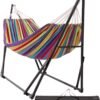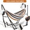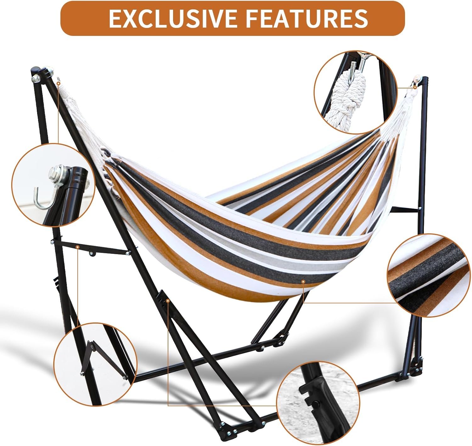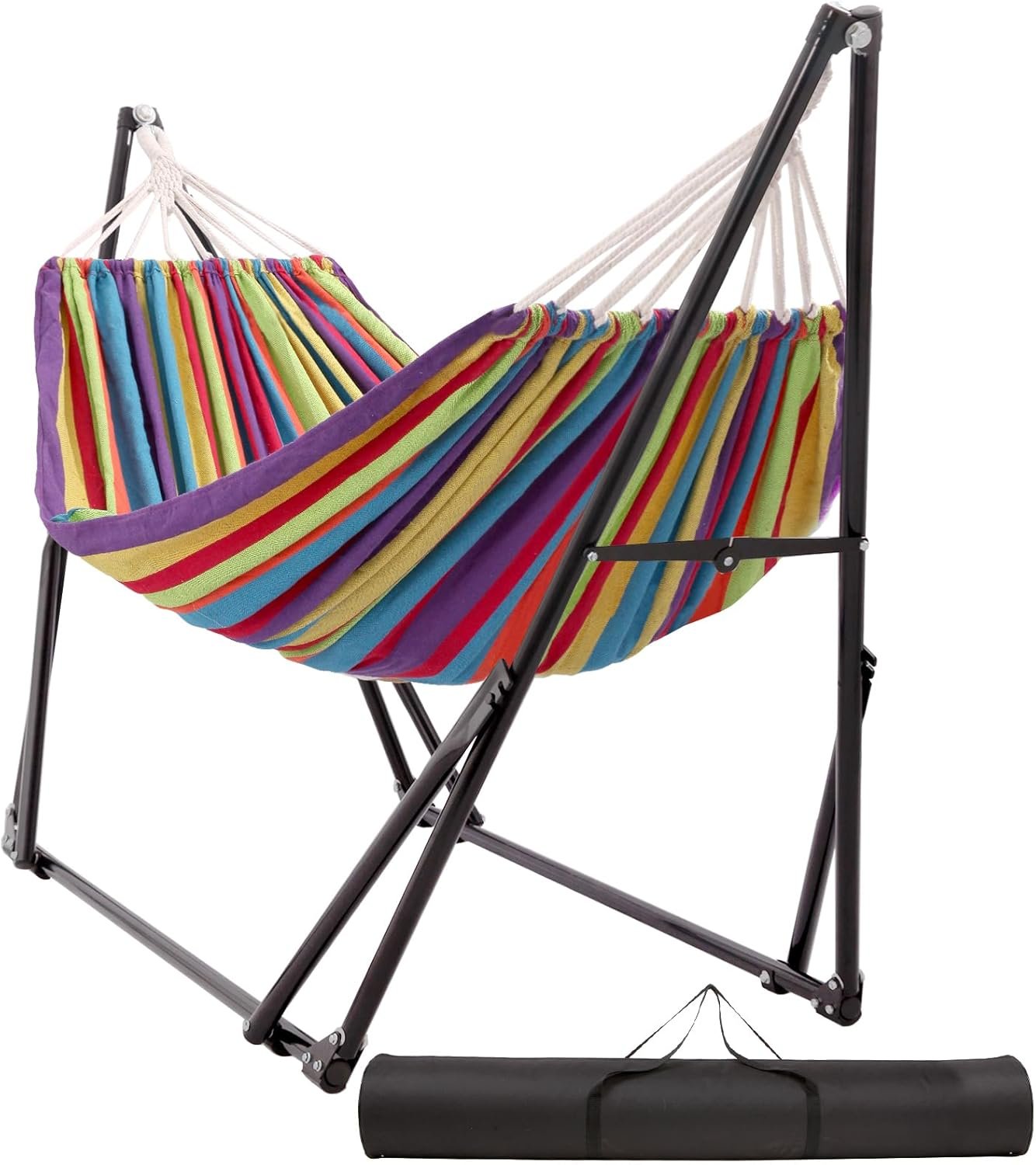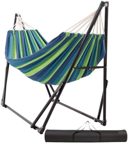 — Estilo brasileño de moda: la combinación de rayas de color contrastantes y soporte de acero negro, se convierte inmediatamente en el punto culminante de tu patio y choca con una vida brillante. —.Soporte de acero plegable: esta hamaca cuenta con un soporte de acero plegable, que es fácil de instalar y desmontar. —Tensión frágica ajustable: antes de acostarse en esta hamaca, puede ajustar la apertura del soporte de acero para elegir una tensión más cómoda para su cuerpo. Extiende tu peso en el centro y disfruta de una relajación libre de gravedad. —Hamaca de servicio pesado: la hamaca con soporte viene con soporte de acero resistente, capacidad de peso de hasta 616 libras. —Amplia aplicación: la hamaca incluye un soporte, se pliega fácilmente en una bolsa de transporte compacta para que puedas llevar tu comodidad sobre la marcha. Muy adecuado para descansar y relajarse en dormitorios, jardines exteriores, terrazas, patios, balcones y al aire libre.