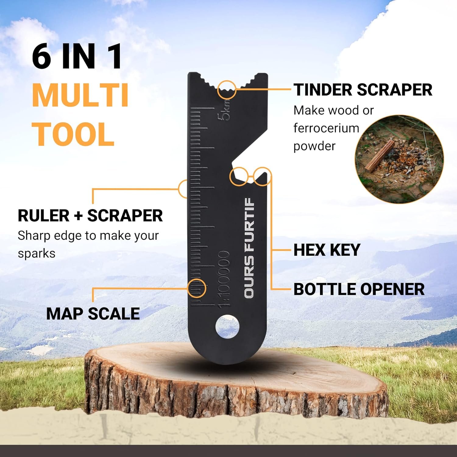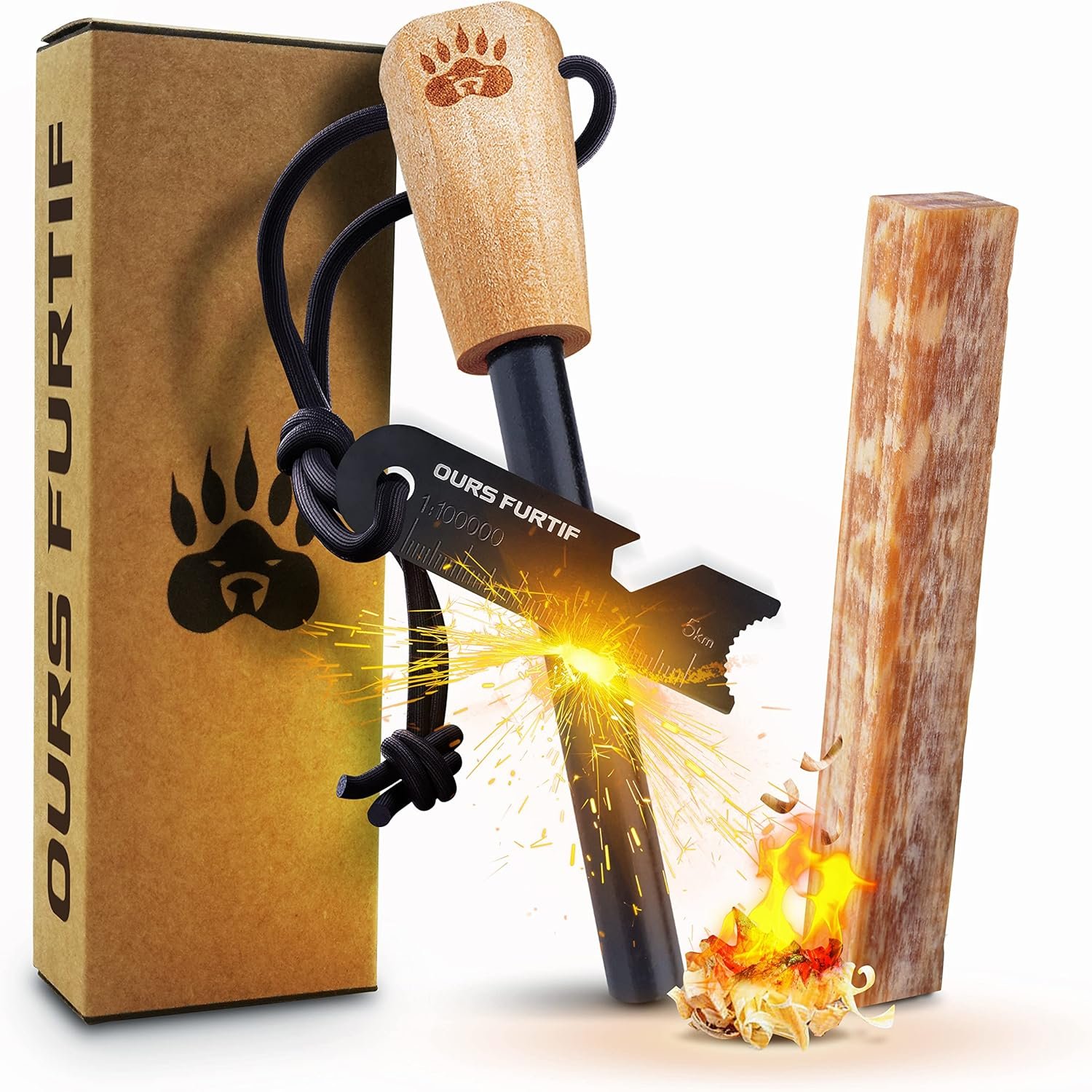 Diseñado para durar: hecho de ferrocerio premium, nuestro arrancador de fuego extra grueso de 3/20,3 cm ofrece más de 15,000 golpes, superando a los aceros de fuego estándar en un 50%. Una herramienta de supervivencia duradera y de alta eficiencia construida para soportar años de aventuras Funciona en todas las condiciones: lluvia, viento o nieve, este iniciador de fuego impermeable garantiza una llama confiable. Incluso si se cae en agua, el palo de yesca de madera natural proporciona una fuente de encendido rápida y eficaz para tu fuego Kit de supervivencia todo en uno: todo lo que necesitas para arrancar fuego en un kit compacto: varilla de ferro extragrande, golpeador multiherramienta (regla, llave hexagonal, abridor de botellas), yesca de madera natural y una bolsa de almacenamiento duradera. Ideal para bushcraft, camping, senderismo y situaciones de supervivencia Respetuoso con el medio ambiente y construido para durar: con un mango de madera natural y un embalaje 100% reciclable, nuestro iniciador de fuego es sostenible y duradero. Sin plástico, sin desperdicios, solo una herramienta confiable para iniciar incendios para aventureros responsables OURS FURTIF Diseñado por expertos en Francia: a diferencia de los iniciadores de fuego genéricos, nuestros productos se desarrollan cuidadosamente a través de años de investigación y pruebas en el mundo real. Refinamos y mejoramos cada aspecto para crear las herramientas de arranque de fuego más eficientes y fáciles de usar. Además, disfrute de acceso exclusivo a guías, tutoriales y un equipo de atención al cliente receptivo