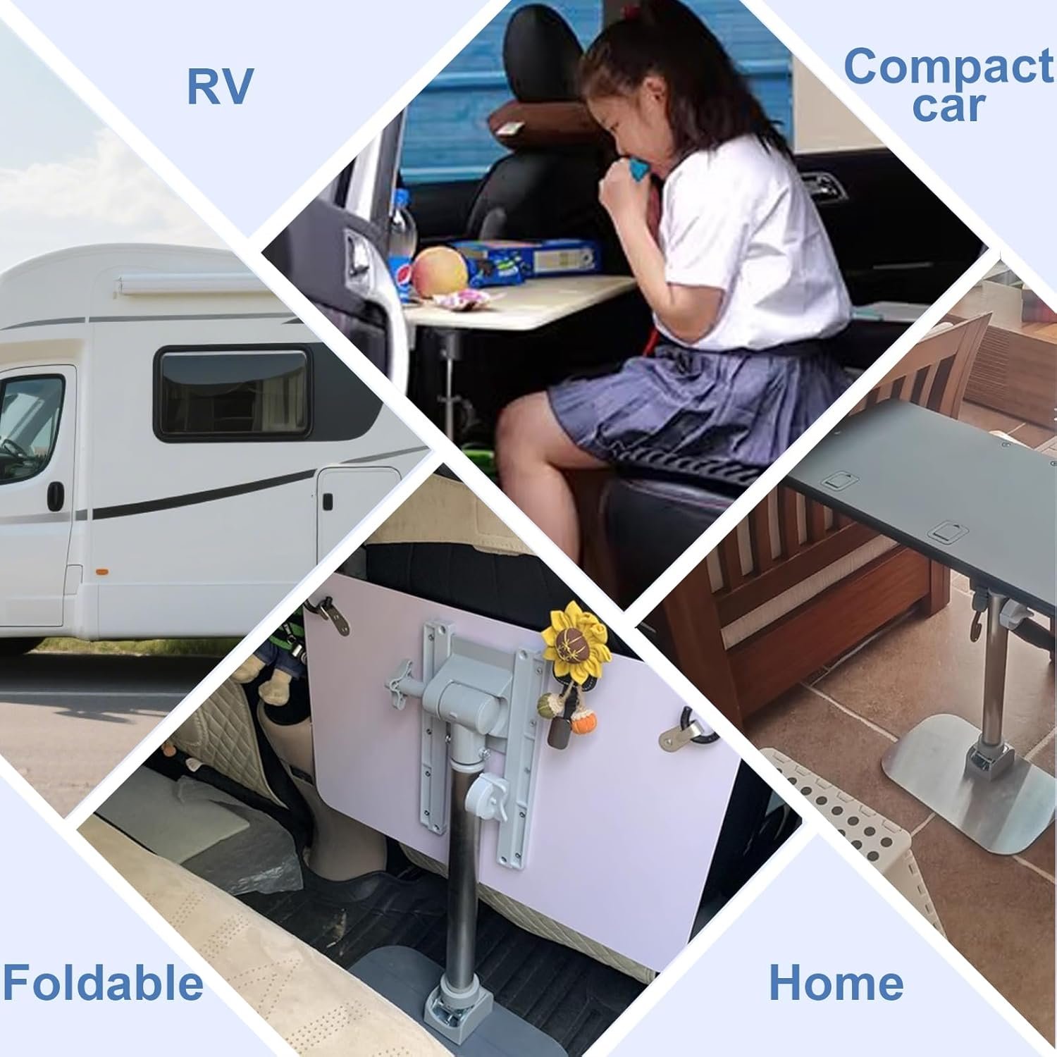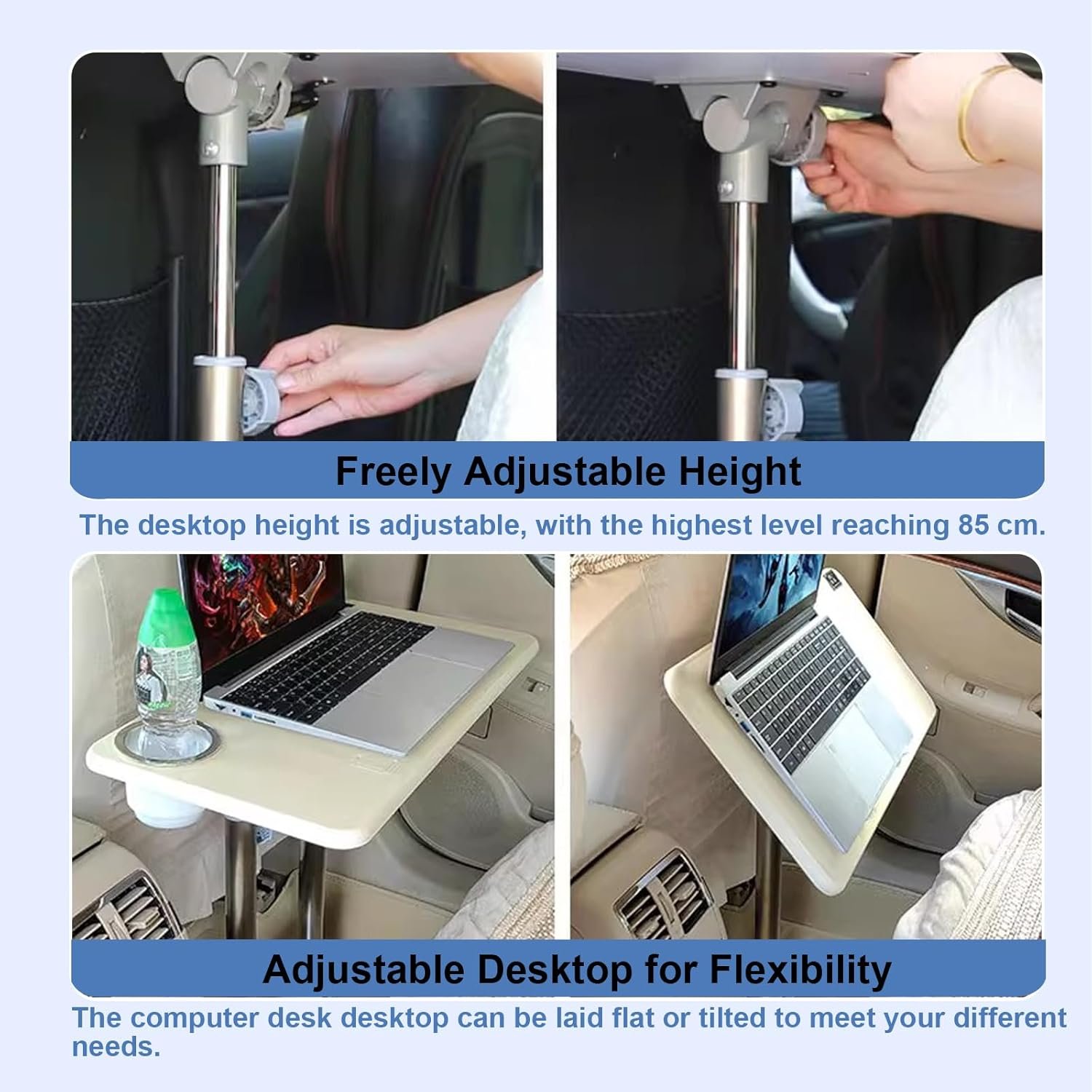 Selección de tamaño: Al seleccionar el tamaño, puede cortar una pieza de cartón de 59,9 cm x 30,0 cm, sentarse en el asiento del pasajero y probar el tamaño detrás del respaldo. Si no encaja, intente cortarlo en 50,0 cm x 27,9 cm. Si la mesa encaja, la base generalmente también puede Durabilidad: La mesa de este pequeño escritorio está hecha de paneles gruesos, hechos de madera maciza a través de trituración mecánica, asegurando dureza y resistencia al desgaste. Los bordes son redondeados y pulidos. Las patas están hechas de varillas de acero inoxidable, resistentes al óxido, con una capacidad de carga de 33.1 lbs/33 libras Plegable: el soporte para estación de trabajo de computadora de escritorio cuenta con un diseño plegable, lo que permite plegarse completamente en cuestión de segundos. Se puede almacenar cómodamente en el maletero o debajo del asiento, ahorrando espacio dentro del vehículo Ajustable: El escritorio de esta pequeña mesa es ajustable, lo que permite colocarla plana o inclinada, ofreciendo flexibilidad y comodidad. La altura también es ajustable, con un rango de 21.7-85,1 cm, para satisfacer tus diversas necesidades Cinturón de seguridad: Proporcionamos un cinturón de seguridad para sujetar de forma segura la mesa al respaldo del pasajero, aliviando problemas de inestabilidad durante la conducción. También cuenta con tiras antideslizantes ocultas para evitar que los artículos se caigan durante giros bruscos, asegurando un uso seguro
