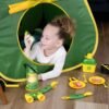 Juego de 18 piezas: incluye todo lo que tu pequeña caravana necesita, con toneladas de accesorios de simulación como una cantina, platos, utensilios, comida de juego, ollas binoculares, linterna, linterna y mucho más Fogata realista: la hoguera interactiva se ilumina, hace sonidos realistas y libera vapor de agua que imita el humo, añadiendo un divertido elemento sensorial para jugar. Listo para la aventura: tienda de campaña desplegable en forma de triángulo con una entrada enrollable y gráficos icónicos de John Deere perfectos para aventuras de campamento imaginativas. Aprende a través del juego: fomenta la creatividad, las habilidades motoras finas y la exploración sensorial mientras los niños interactúan con los accesorios, la comida y la fogata. Portátil y fácil de almacenar: la tienda de campaña ligera se instala en segundos, se pliega fácilmente y todos los accesorios encajan perfectamente en la bolsa incluida para un almacenamiento o viaje convenientes.