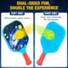 Juego de pickleball perfecto para niños: diseñadas para niños de 4 a 12 años con una cara más ancha de 20,5 cm y un agarre antideslizante, estas paletas de pickleball son perfectas para niños y principiantes. Para que puedan golpear fácilmente y mantenerse seguros, cómodos y emocionados de jugar Diseño de paleta duradero: hechas de plástico PP resistente y ligero, estas paletas de pickleball son juguetes y juegos seguros para niños de 4 a 8 años, con un agarre ergonómico, bordes curvos suaves y una construcción de una sola pieza que no se agrieta, protegiendo las muñecas cada juego Juguete de juego multiescena: con un gráfico estrellado brillante y tecnología impermeable, anti-pelado, estos juegos de paletas funcionan muy bien como juguetes de playa y regalos de cumpleaños para niños. Los niños pueden jugar en la piscina, patio trasero, parque o en interiores con facilidad y estilo Juego de doble cara: el lado suave desarrolla habilidades motoras mientras que el lado duro agudiza la coordinación mano-ojo. Incluye bolsa de malla para un fácil transporte y almacenamiento. Este diseño versátil permite que la paleta se adapte y crezca con el nivel de tus hijos Idea de regalo perfecta para niños: esta paleta de pickleball es imprescindible para las familias, es un gran regalo de Navidad y cumpleaños para niños de 4 5 6 7 8 9 10 11 12 años. También es la sorpresa perfecta de carnaval, aportando diversión activa para todos