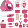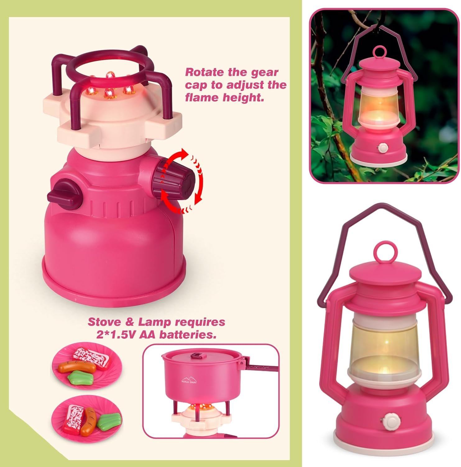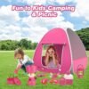 Juego completo de 26 piezas de juguetes de campamento de simulación: la tienda de campaña rosa para niños incluye 26 accesorios para configurar aventuras de campamento de niñas. Viene con 1 tienda de campaña rosa, 1 lámpara de aceite, 1 estufa de campamento, 1 pala, 2 ollas de cocina de diferentes tamaños, 1 binocular, 1 reloj, 1 silbato 3 en 1, 1 cubiertos 4 en 1, 1 juego de comida y 1 juego de herramientas para colgar. Tienda desplegable resistente y segura para niños: diseño plegable adoptado, esta tienda de campaña para niños pequeños se puede desplegar y plegar fácilmente en segundos sin necesidad de montaje. La tienda de campaña es suave pero resistente para soportar varios rollos ásperos en el interior de los niños sin deformación mientras mantiene su seguridad. LAS NIÑAS NECESITAN SU PROPIO ESPACIO SECRETO PARA SER SÍ MISMO: La carpa rosa puede adaptarse a 1-2 niñas pequeñas sentadas. Los niños pueden susurrar juntos, juegos de rol utilizan el juego de juguetes de campamento, tomar una siesta o leer dentro de la tienda. Esta es una gran opción de regalo para niños introvertidos y autistas. ¿A quién no le gusta un espacio secreto para ser ellos mismos libremente? Juguetes completos ultrarrealistas: el paquete de tienda de campaña desplegable viene con una estufa que se puede ajustar la altura de la llama, 2 ollas, 2 platos de comida de juego y una lámpara de aceite. Añade gran diversión al juego de casa de juegos para interiores y exteriores para niños. Ps: La lámpara y la estufa necesitan 2 pilas AA pero no incluidas. El mejor regalo todo en uno para niñas de 3 a 6 años: perfecto para un juego de simulación en interiores o un verdadero amante de la aventura de campamento al aire libre. El juego de equipo de campamento es un regalo ideal de cumpleaños, Navidad, Halloween y día del niño para niños de 3, 4, 5, 6, 7, 8 años.