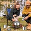 Juego de utensilios de cocina para acampar: El juego de utensilios de cocina de camping de 14 piezas incluye: 2 ollas, 1 sartén, 1 plato, 2 platos de borde de carrete, 2 tazas, 2 juegos de cubiertos (2 tenedores, 2 cuchillos, 2 cucharas) para cada necesidad de cocinar, voltear, hervir o freír para 1-2 personas Tamaño del producto: el peso total de la vajilla es de solo 1.85 libras, el tamaño del paquete es de 22,9 cm x 15,7 cm x 8,6 cm, la longitud del cuchillo, el tenedor y la cuchara cuando se despliega es de 15,5 cm, adecuado para uso en adultos, y el tamaño portátil y compacto es adecuado para mochileros y acampar tradicionales Duradero y fácil de limpiar: hecho de materiales no tóxicos de calidad, el juego de platos está hecho de acero inoxidable 410, la vajilla está hecha de acero inoxidable 304 y resistente a altas temperaturas y congelación, la estructura es fuerte, suave y brillante, fácil de limpiar y duradera; ideal para picnics, mochileros, senderismo; Nota: evita que se queme en seco Fácil de transportar: los cubiertos tienen un asa plegable para almacenamiento, y vienen con una bolsa de nailon compacta para un fácil almacenamiento y ahorro de espacio, este juego de accesorios de campamento es perfecto para camping, senderismo, mochileros, picnics, aventuras al aire libre y otras actividades al aire libre Buen regalo al aire libre: para amigos o familiares que aman el aire libre, este es un bonito y práctico regalo para Navidad, cumpleaños, aniversarios, vacaciones, y estarán muy felices de recibir este práctico juego de cubiertos al aire libre