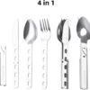 Acero inoxidable, superficie lisa y redonda, no se oxida fácilmente, no es fácil de romper, muy duradero. CUBIERTOS DE CAMPING 4 EN 1: Tenedor, cuchara, cuchillo y abrebotellas desmontable Multiherramienta de bolsillo: material de acero inoxidable ligero, resistente, compacto, libre de óxido y duradero Cubertería multiherramienta en un juego compacto que integra cuchara, tenedor, cuchillo y abrelatas de botellas/latas en una unidad compacta, perfecto para senderismo, camping, supervivencia o kits de emergencia Fácil de transportar: se expande de una manera sencilla, simplemente tira hacia arriba. El cuchillo, el tenedor, la cuchara y el abrelatas se pueden combinar, ocupando poco espacio, fácil de llevar en la mochila, lo suficientemente pequeño como para caber en un bolsillo o en una mochila. Llévalo para viajes de mochilero, viajes de senderismo, actividades al aire libre, noches de campamento o durante las comidas, comidas o cenas. Ideal para camping, senderismo o viajes en general.