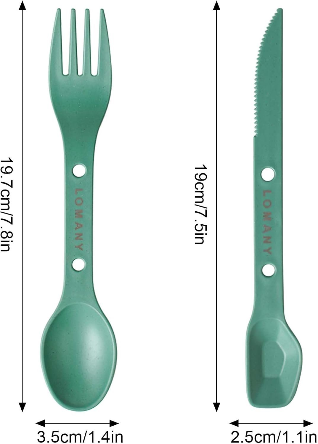 Cuchillo de camping 4 en 2: no es necesario empacar múltiples utensilios de cocina para acampar: nuestros utensilios de camping cuentan con un tenedor y cuchara dedicados, un cuchillo y una cuchara de queso para cortar y cavar salsa Compañero perfecto para viajar: hecho de plástico resistente, este tenedor es una opción ideal para actividades como camping, mochilero, exploración, picnics e incluso para comidas empacadas Diseño ergonómico: como un utensilio de campamento definitivo, nuestros tenedores te permiten saborear cómodamente sopas, yogures, ensaladas y pastas, y son capaces de cortar proteínas Portátil y conveniente: el mango está diseñado con 2 agujeros para reducir el peso y servir como puntos de fijación, lo que facilita la fijación del tenedor a su mochila o kit de desorden con la correa de cordón proporcionada Compacto y práctico: este tenedor apto para microondas y lavavajillas mide 7.9 in de largo. Cada juego pesa solo 0.7 onzas (0.71 oz)