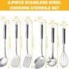Juego completo de utensilios de cocina: el juego de utensilios de cocina Gymdin de 6 piezas incluye todo lo que necesitas: una espátula, un volteador ranurado, un cucharón de sopa, una cuchara ranurada, un batidor y un servidor de pasta, por lo que es una opción ideal para cualquier chef casero Acero inoxidable de alta calidad: hecho de acero inoxidable de alta calidad, nuestros utensilios de cocina están construidos para durar. El juego de utensilios de cocina de metal es resistente al calor, resistente y resistente a la corrosión y al óxido, asegurando una cocción segura para ti y tu familia mientras proporciona resistencia y durabilidad Fácil de limpiar y apto para lavavajillas: el diseño sin costuras de los utensilios de cocina de acero inoxidable hace que la limpieza sea muy fácil. Este juego de utensilios de cocina de metal es apto para lavavajillas, lo que te da más tiempo para disfrutar de tus comidas y menos tiempo preocupándote por la limpieza Diseño ergonómico y que ahorra espacio: cada utensilio cuenta con un mango ergonómico con un pequeño orificio para colgar fácilmente, lo que permite un almacenamiento eficiente y soluciones de ahorro de espacio en tu cocina. El juego de utensilios de cocina ofrece practicidad y comodidad en la cocina diaria Esencial para la cocina diaria: ya sea que estés preparando una comida gourmet o una simple cena familiar, el juego de utensilios de cocina de acero inoxidable es un conjunto de herramientas imprescindible que mejora tu experiencia de cocina y garantiza la eficiencia Opción de regalo ideal: este exquisito juego de utensilios de cocina de 6 piezas es el regalo ideal para inauguraciones de la casa, vacaciones o cualquier ocasión especial. Es un regalo pensado y práctico que tus amigos y familiares realmente apreciarán