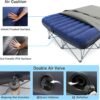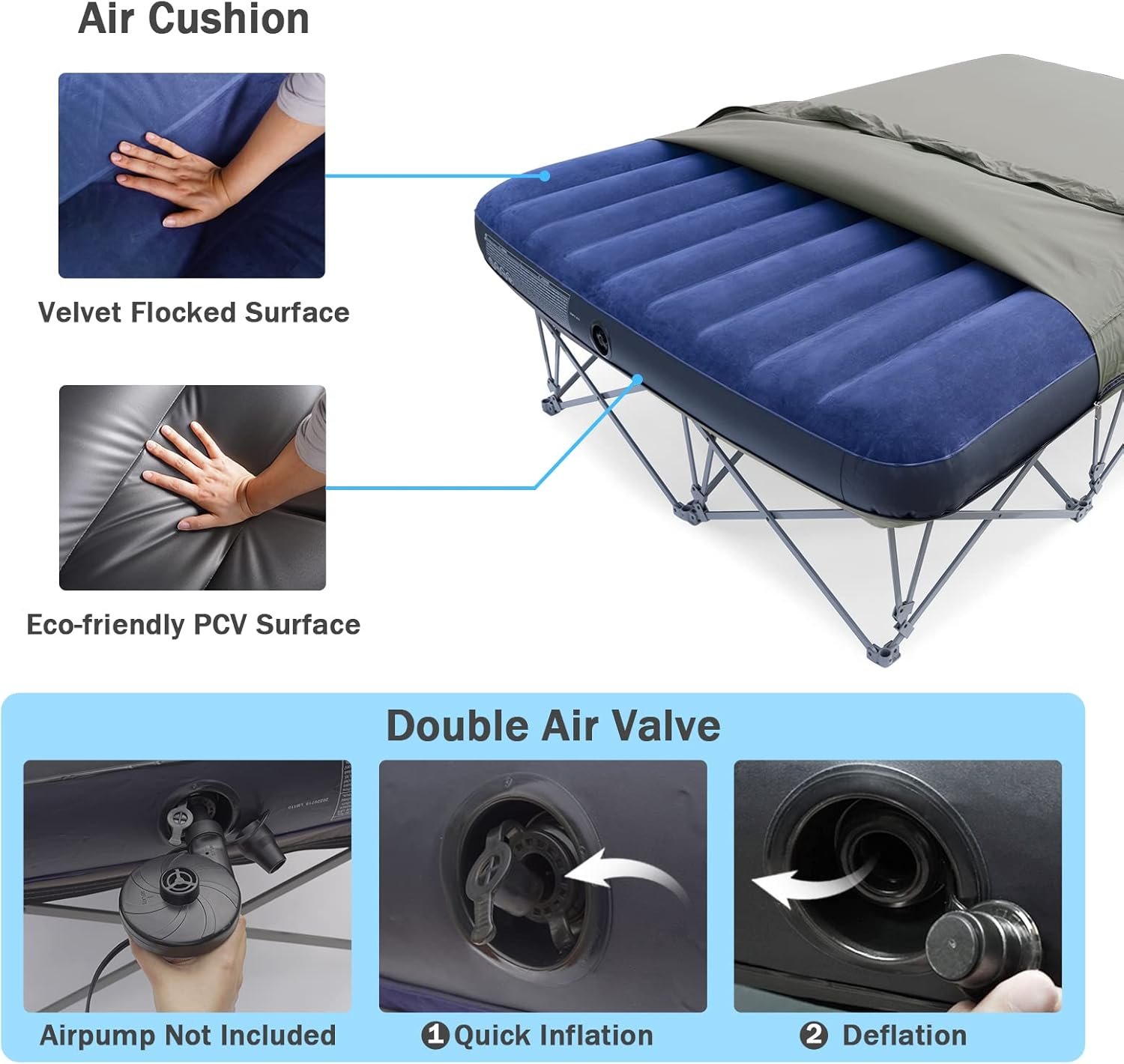 PVC y poliéster Solución simple para la comodidad del campamento: esta cuna de camping para 2 personas con un colchón de aire es cómoda y confiable, lo que te hará dormir más cómodamente en una tienda de campaña. Es tan agradable estar fuera del suelo cuando acampas Uso en casa para visitantes: el colchón de aire de cama de campamento para 2 personas se puede utilizar como una cama adicional y es práctico cuando tienes familiares o amigos adicionales que visitan y se quedan Fácil de montar y almacenar: esta cuna de camping viene con una bolsa de transporte, y es fácil de instalar. Simplemente despliega completamente la base de metal, coloca el colchón de aire en el cmbolsillo cm e infla todo listo. Y se pliega para un fácil almacenamiento Diseño único de cama de aire: la cuna de camping con un colchón de aire hecho de un marco de acero antioxidante y una tela Oxford duradera con revestimiento de PVC. El diseño único de la cama de aire reduce el ruido cuando te mueves o entras y sales de la cama Resistente y gran soporte de borde: tubo de acero resistente, estructura en forma de X de la cuna de viaje que garantiza seguridad y estabilidad y puede soportar hasta 500 libras. Además, esta catre de camping ofrece un excelente soporte de borde, lo que brinda una experiencia más cómoda