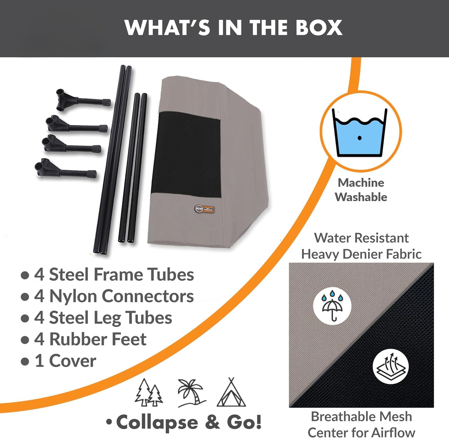 Instrucciones: Utiliza esta cama elevada para perros en interiores o exteriores para elevar a tu mascota del suelo y mantenerla fresca. La cubierta central de malla permite un flujo de aire constante a tu mascota. Perfecto para patios traseros, senderismo, campamento o en tu hogar.