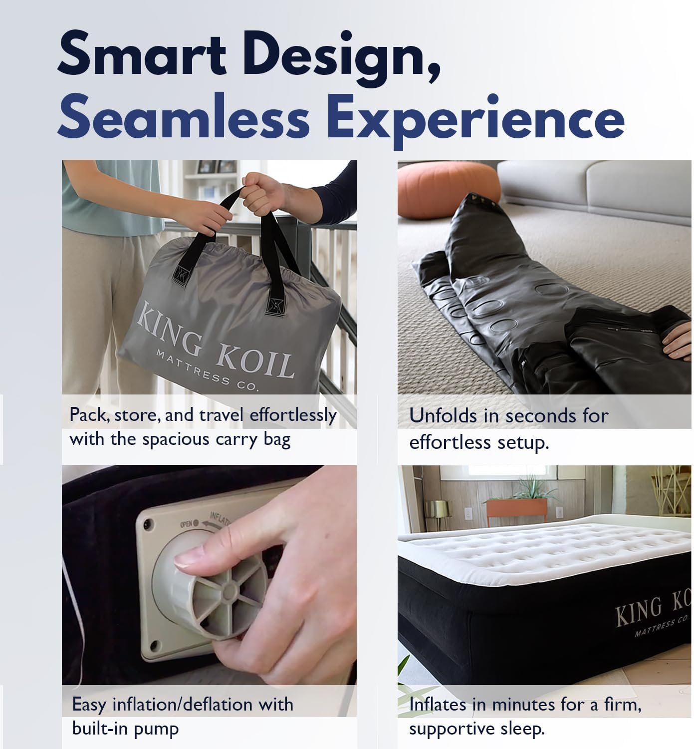Totalmente flocado El colchón de aire de tamaño queen de King Koil con tecnología mejorada tiene una capa suave aterciopelada y una almohada integrada. Diseñado para la máxima comodidad. Parte superior acolchada, cómoda, impermeable, extragruesa y duradera con soporte adicional para la columna vertebral. Colchón firme que permite que tengas una buena postura para dormir. La parte superior de gamuza mantiene la ropa de cama en su lugar. La bomba de aire cuenta con perillas separadas para inflar y desinflar el colchón de manera simple y rápida. Cama de aire de tamaño queen con estructura de soportes en espiral y una bomba de aire de corriente alterna integrada de 120 V/210 W. Dimensiones del colchón inflado: 203,2 cm x 152,4 cm x 50,8 cm. Todos los colchones de aire de King Koil incluyen kits con parches en caso de que perfores o rasgues accidentalmente el colchón. Bomba de aire interna y fácil de usar que permite inflar o desinflar el colchón rápida y fácilmente. El colchón de King Koil se infla completamente en menos de 2 minutos. El colchón de aire de King Koil está diseñado para uso en casa y es perfecto para huéspedes, amigos o familiares, y viajes de campamento. Recuerda que, aunque el colchón conserva el aire extremadamente bien, puedes usar la bomba de aire durante algunos segundos para inflar o desinflar el colchón a tu nivel deseado. – King Koil es el único fabricante que cuenta con el respaldo de la Asociación Internacional de Quiroprácticos para ayudar a promover una correcta alineación de la columna vertebral y noches de sueño más saludable.