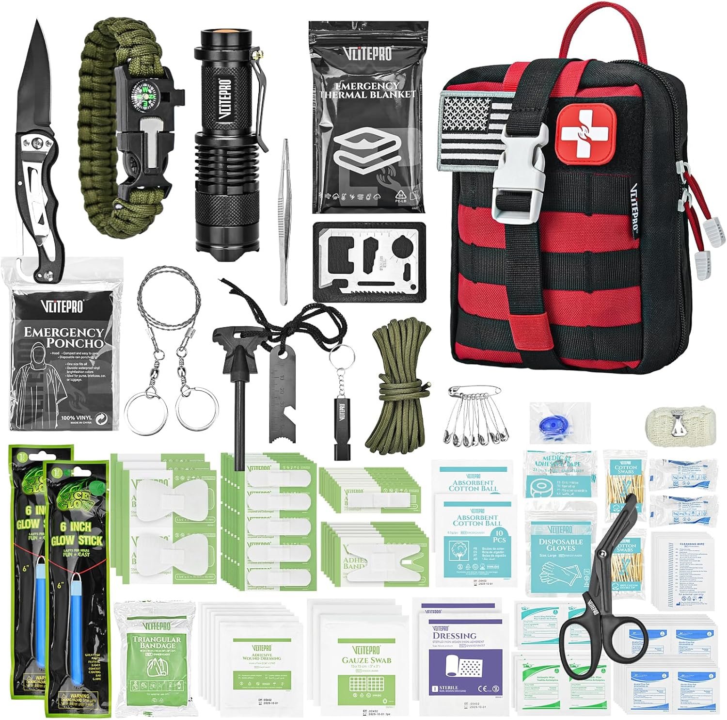 Kit integral de primeros auxilios: está diseñado profesionalmente por un equipo de profesionales, siempre puedes responder a todo tipo de crisis y hacer frente a todo tipo de emergencias. Incluye suministros esenciales de primeros auxilios y herramientas de supervivencia diaria, perfectas para la familia, aventuras al aire libre o desastres repentinos. Tamaño compacto, fácil de llevar. Esenciales para acampar al aire libre: se puede utilizar para lidiar con lesiones directamente en caso de desastre o viajes al aire libre, contiene herramientas básicas de supervivencia para un acceso rápido, incluyendo varios vendajes, pinzas, tijeras, almohadillas de alivio de picadura, linterna, pulsera multifuncional de cuerda de paraguas (cuerda de paraguas naranja, silbato), pedernal, cuchillo, tarjeta de cuchillo militar, dos palos luminosos y manta de emergencia. Se aplica a múltiples escenarios: en comparación con los kits de primeros auxilios ordinarios, nuestro equipo de supervivencia contiene no solo herramientas básicas de tratamiento de lesiones, sino también una variedad de equipos de supervivencia. Perfecto para camping, mochilero, exploración, senderismo, automóvil, barco, bicicleta, motocicleta, lugar de trabajo, viajes, tiro, caza, camping, senderismo, pesca, canotaje, ciclismo, deportes al aire libre, desierto y otras aventuras al aire libre. Diseño portátil Molle: La superficie de la bolsa está diseñada con nailon, todos los artículos se ponen en orden en la mochila. Diseño de tres compartimentos, los productos están codificados por colores y ensamblados de acuerdo con la función, puedes llevarlo en cualquier momento, mientras que las múltiples correas en la parte posterior se pueden montar en cualquier sistema Molle, es un regalo perfecto para hombres, mujeres o personas que aman los viajes al aire libre, caza, camping, viajes en automóvil, aventuras en el desierto. SERVICIO DE CALIDAD: Todos nuestros productos son inspeccionados por nuestro equipo profesional, y esperamos mucho que no encuentre ninguna emergencia. Si tienes alguna pregunta, no dudes en ponerte en contacto con nosotros, haremos todo lo posible para resolverlo por ti y te proporcionamos un servicio de garantía de un año. Asegúrate de tener una buena experiencia de compra.